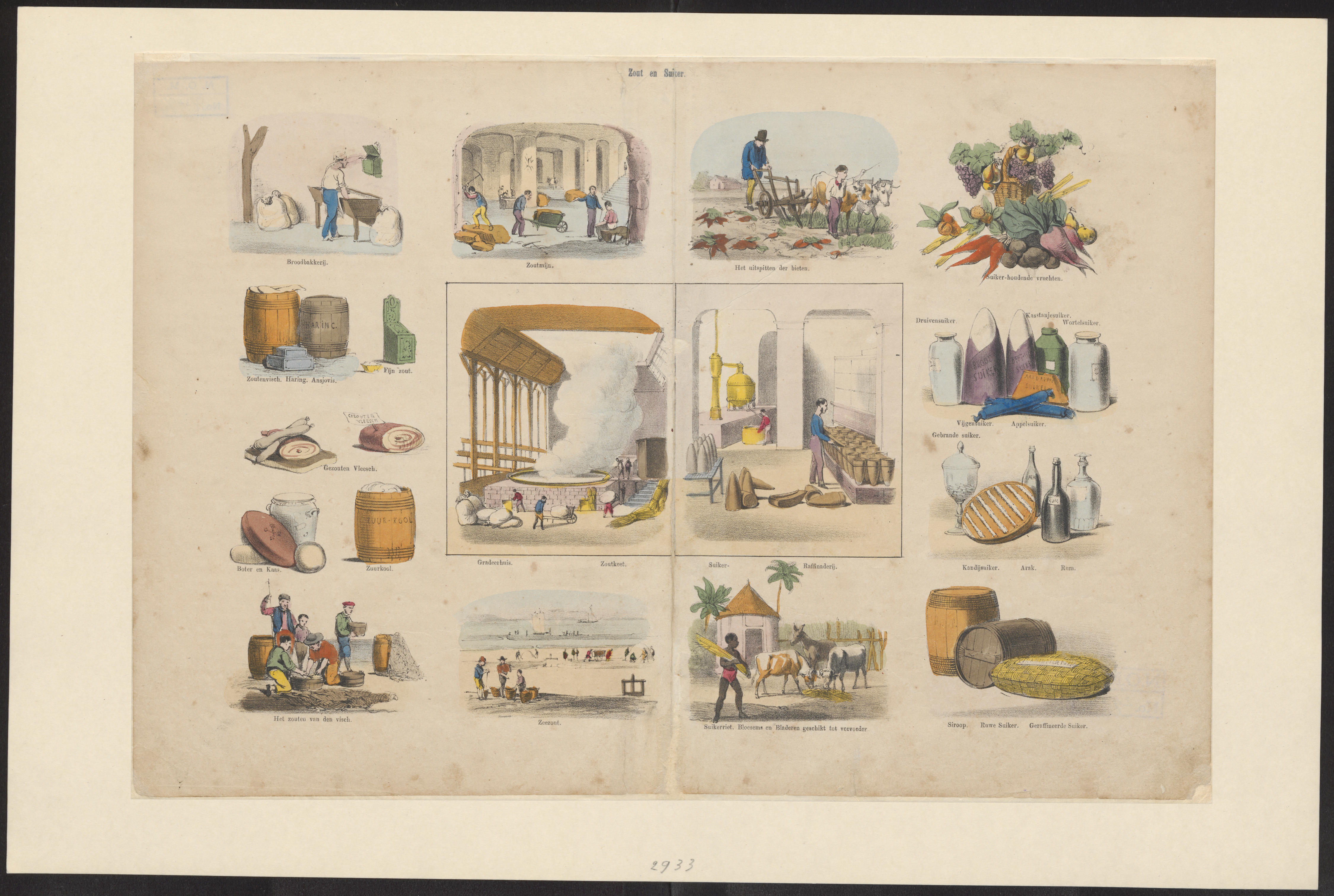 Prent met achttien afbeeldingen, gedrukt in lithografie en met teksten in boekdruk. De prent heeft twee centrale afbeeldingen: links een zoutziederij en rechts een suikerraffinaderij. Eromheen zijn voorwerpen en handelingen te zien die te maken hebben met de verwerking van zout en suiker en de producten die er van gemaakt worden. Omstreeks 1860 bracht de ...