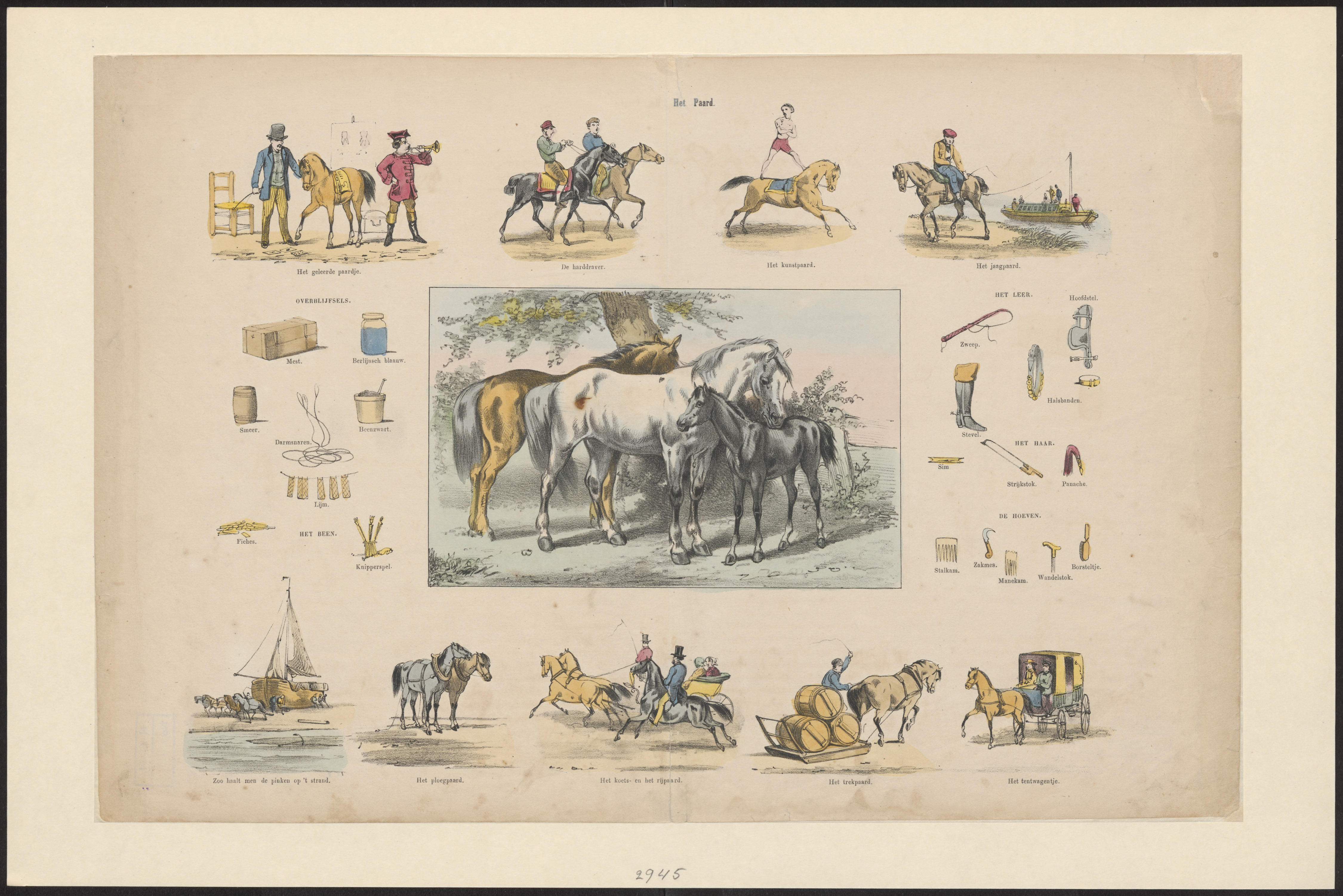 Prent met 30 afbeeldingen, gedrukt in lithografie en met teksten in boekdruk. De centrale afbeelding is van twee paarden en een veulen, met eromheen voorstellingen van voorwerpen en handelingen die te maken hebben met paarden. Omstreeks 1860 bracht de Leidse uitgever Dirk Noothoven van Goor een serie van 25 prenten op de markt onder de ...
