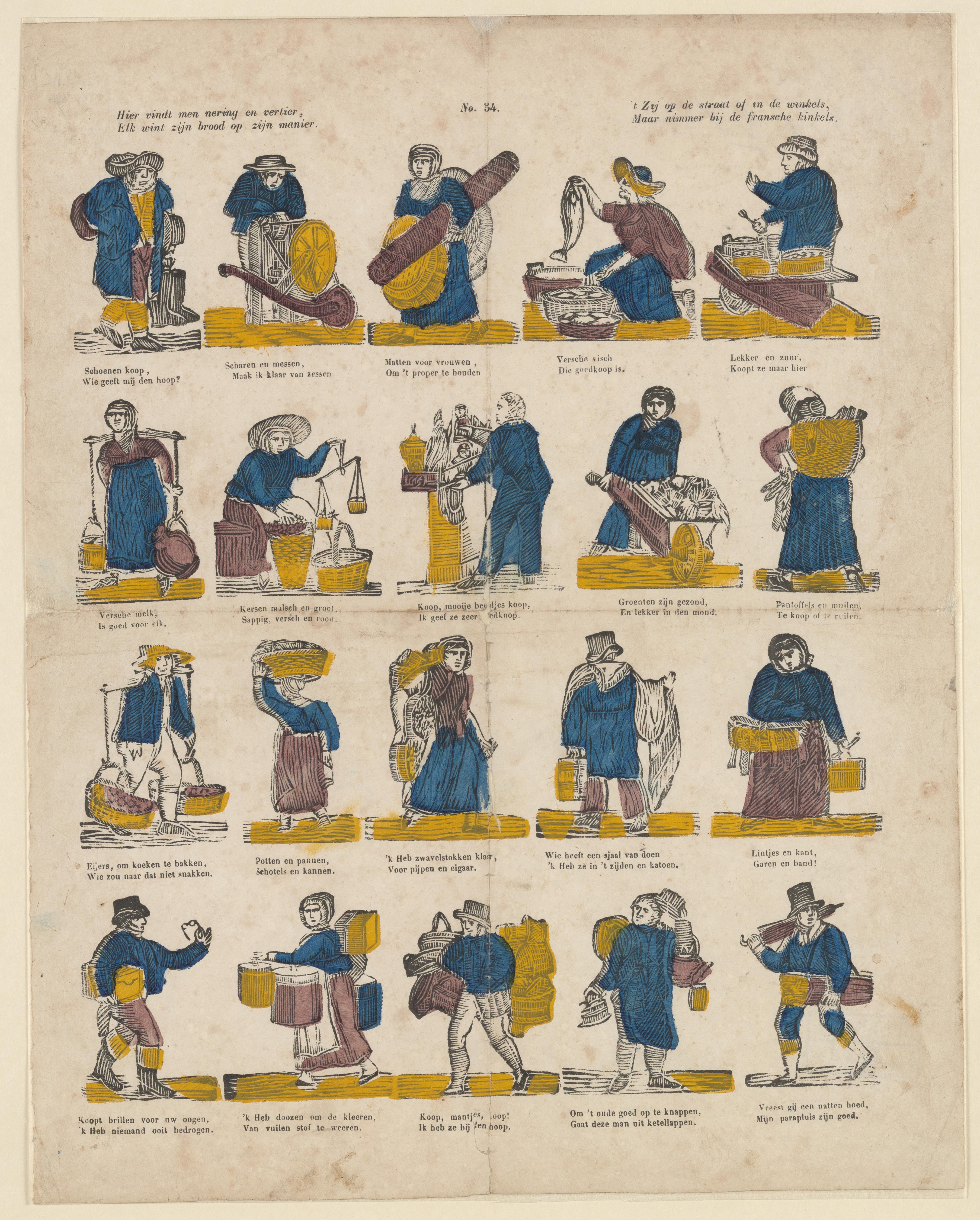 Prent met twintig afbeeldingen van allerlei straatverkopers, gedrukt met afzonderlijke houtsneden en ingekleurd met geel, blauw en rood. Onder iedere afbeelding staat een tweeregelig onderschrift. Op de prent is geen uitgever vermeld. Hij kan worden toegeschreven aan de uitgever Lutkie & Cranenburg in 's-Hertogenbosch.