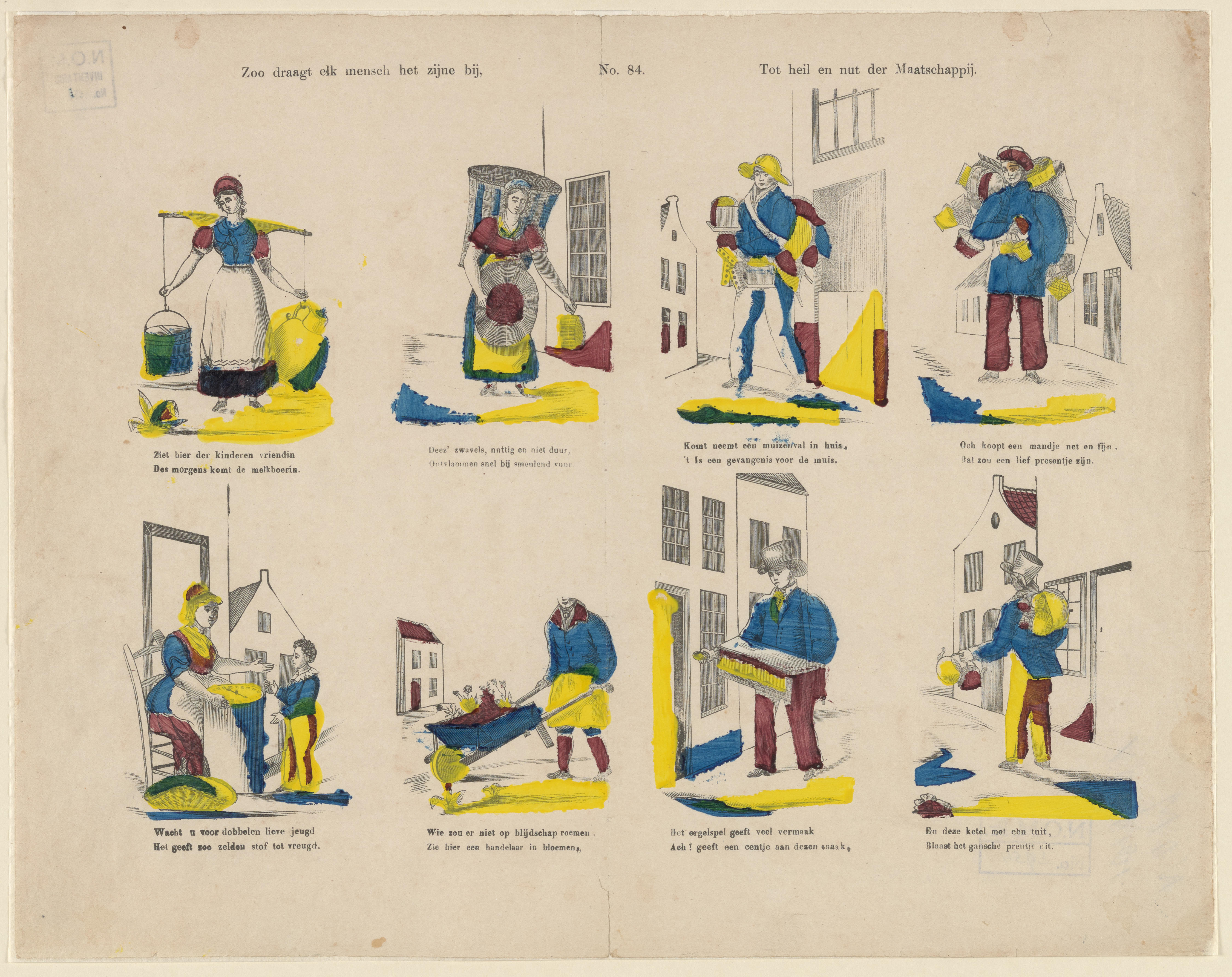 Prent met acht afbeeldingen van verschillende straatverkopers, gedrukt met afzonderlijke houtsneden en ingekleurd met geel, rood en blauw. Onder iedere afbeelding staat een tweeregelig onderschrift. Op de prent is geen uitgever vermeld. Hij kan worden toegeschreven aan de uitgever Lutkie & Cranenburg in 's-Hertogenbosch.