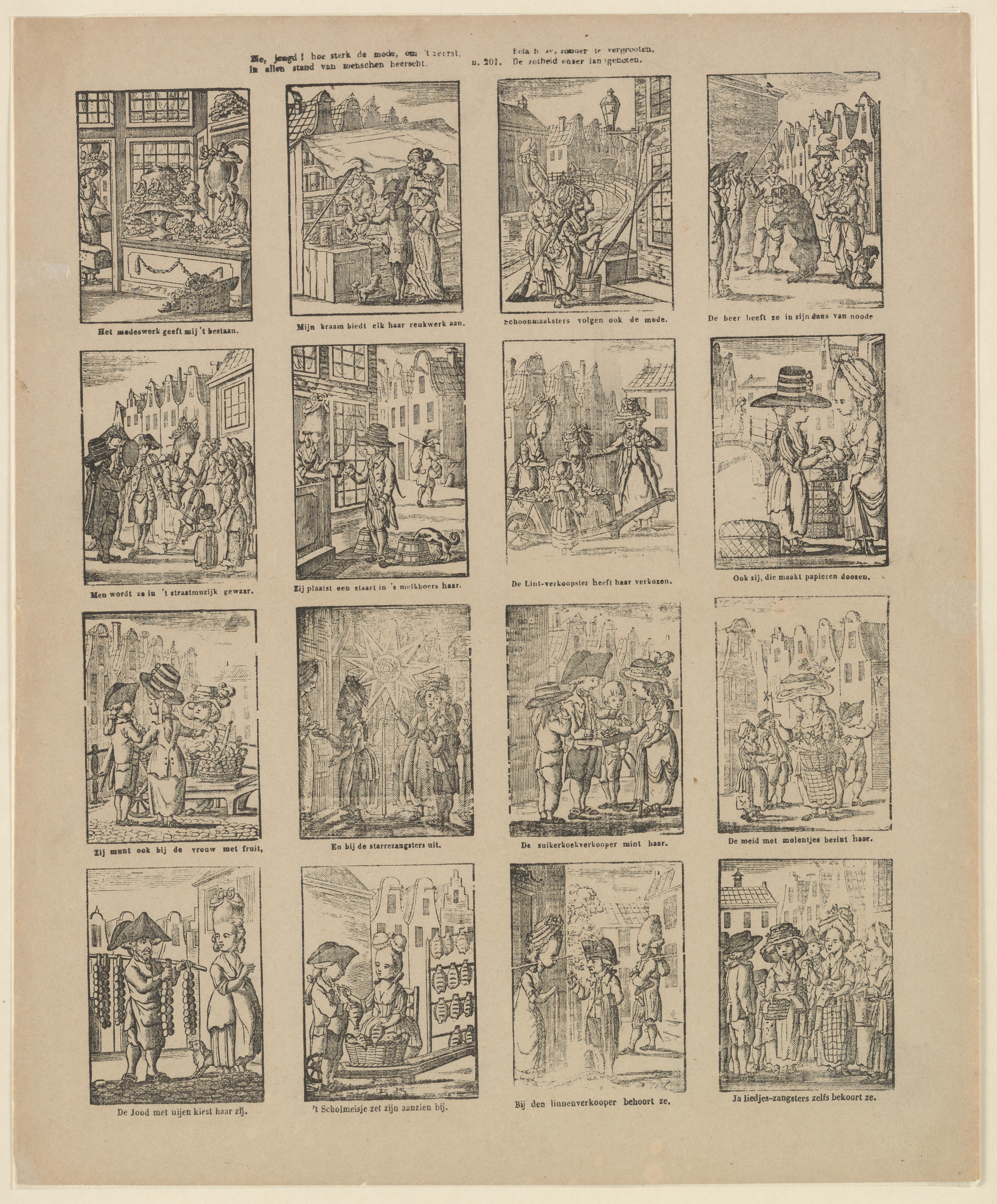 Zie jeugd! hoe sterk de mode, om 't zeerst, / in allen stand van menschen heerscht. // Belach ze, zonder te vergrooten, / De zotheid onzer landgenoten. - N.201.