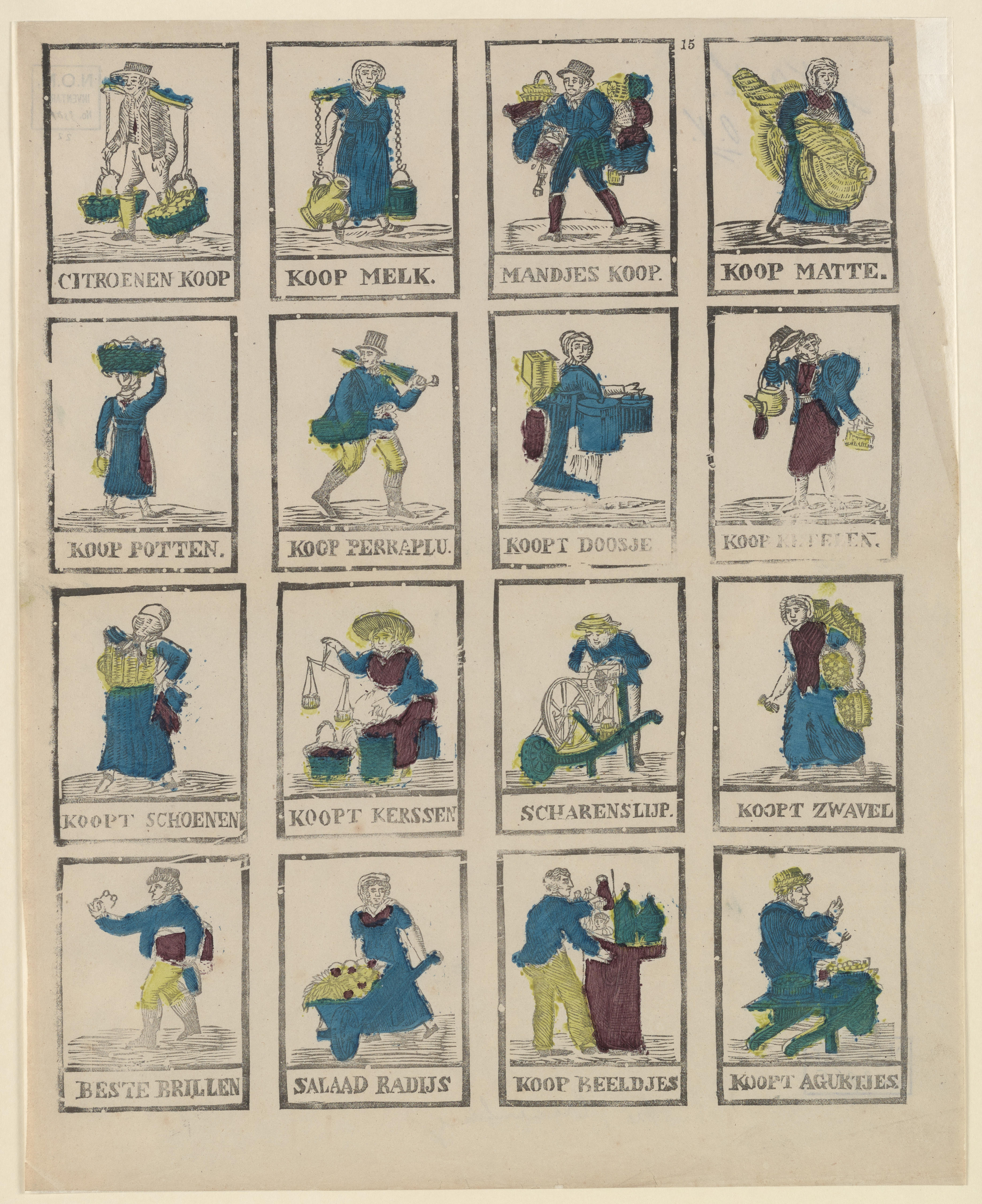 Prent met zestien afbeeldingen van verschillende straatverkopers, gedrukt met afzonderlijke houtsneden en ingekleurd met blauw, geel en rood. In iedere afbeelding staat een onderschrift. Op de prent is geen uitgever vermeld. Hij kan worden toegeschreven aan de uitgever Lutkie & Cranenburg in 's-Hertogenbosch.