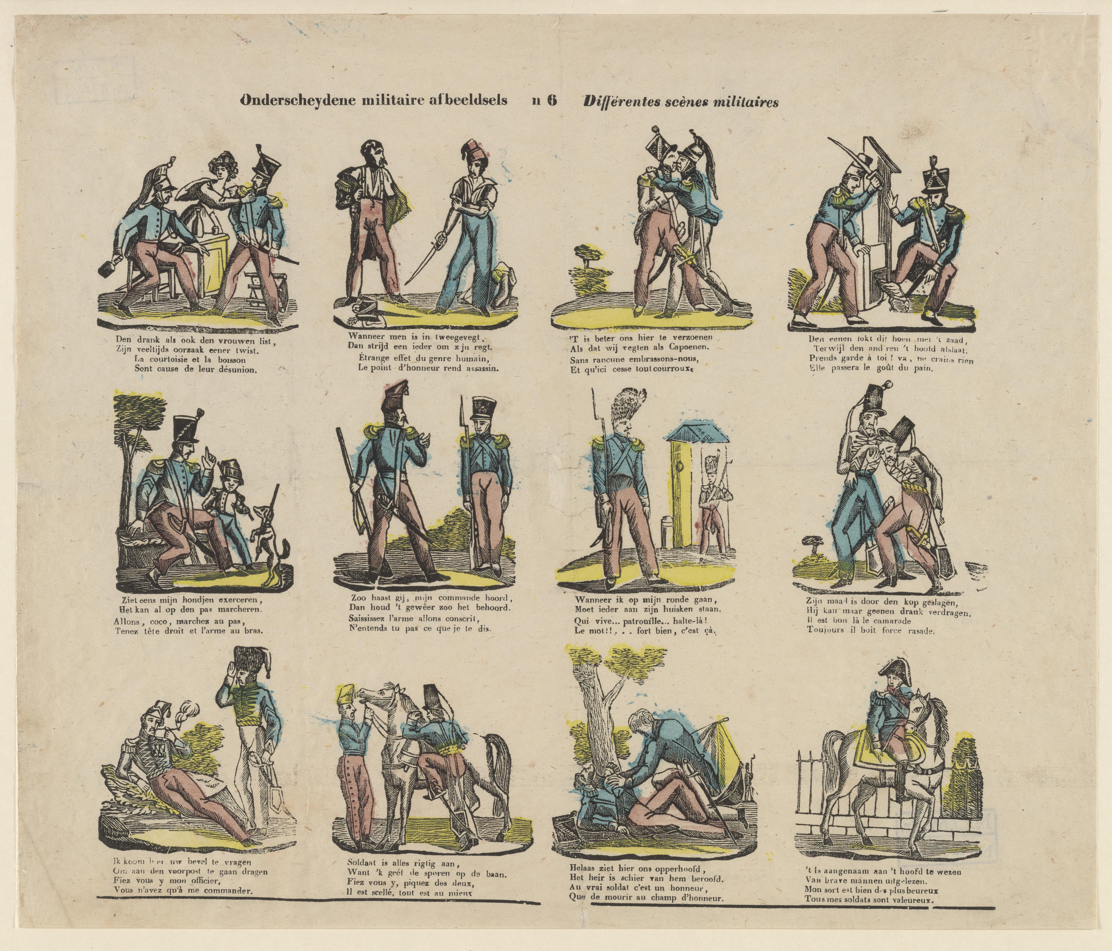 Prent met twaalf voorstellingen van militairen. Op de prent is geen uitgever vermeld. De prent is toegeschreven aan de Turnhoutse uitgever Glenisson & van Genechten of zijn opvolger Glenisson & Zonen.