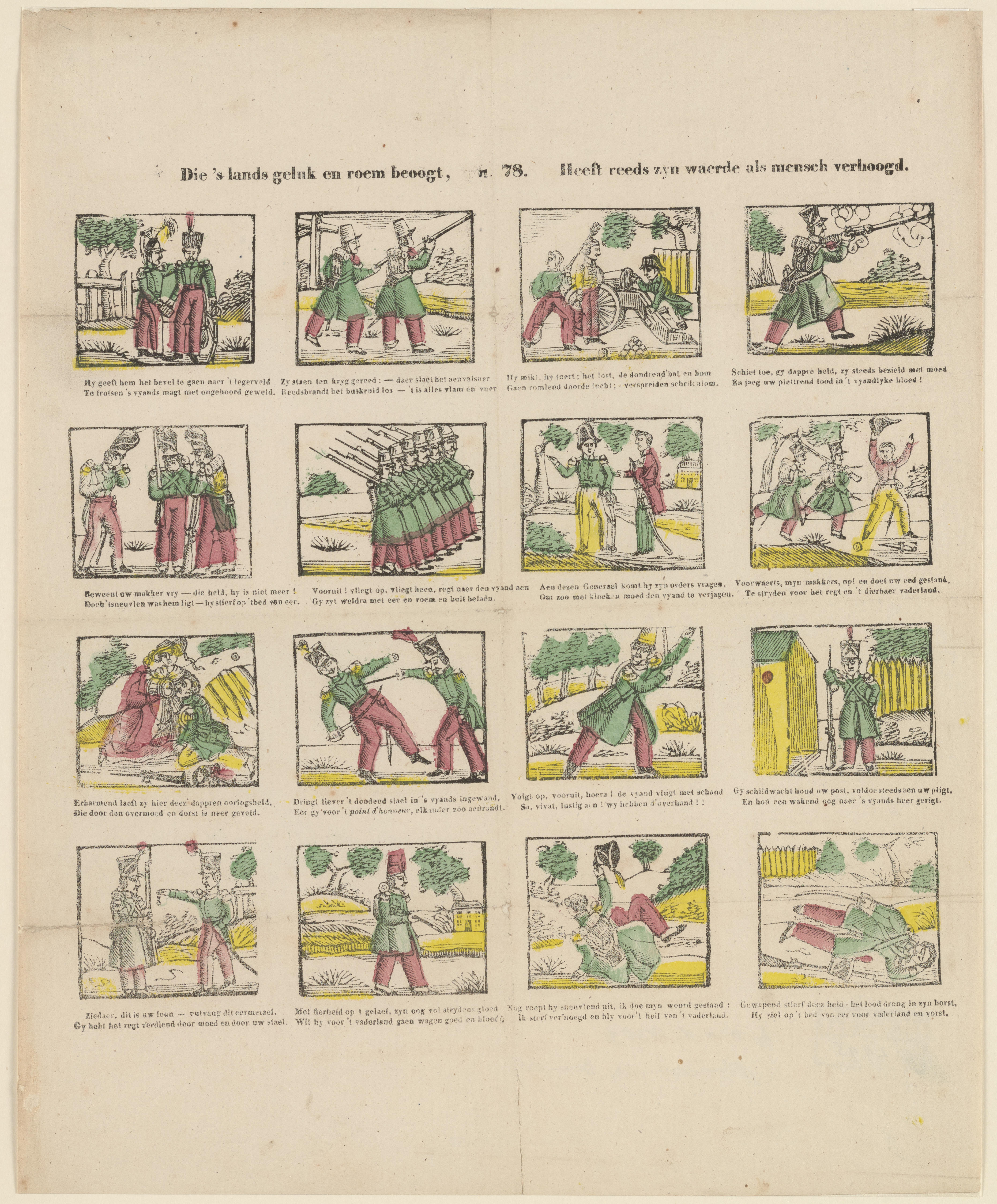 Prent met zestien afbeeldingen van militaire taferelen. Onder elke afbeelding staat een tweeregelig vers. Op de prent is geen uitgever vermeld. De prent is toegeschreven aan de Turnhoutse uitgever Glenisson & van Genechten of zijn opvolger Glenisson & Zonen.
