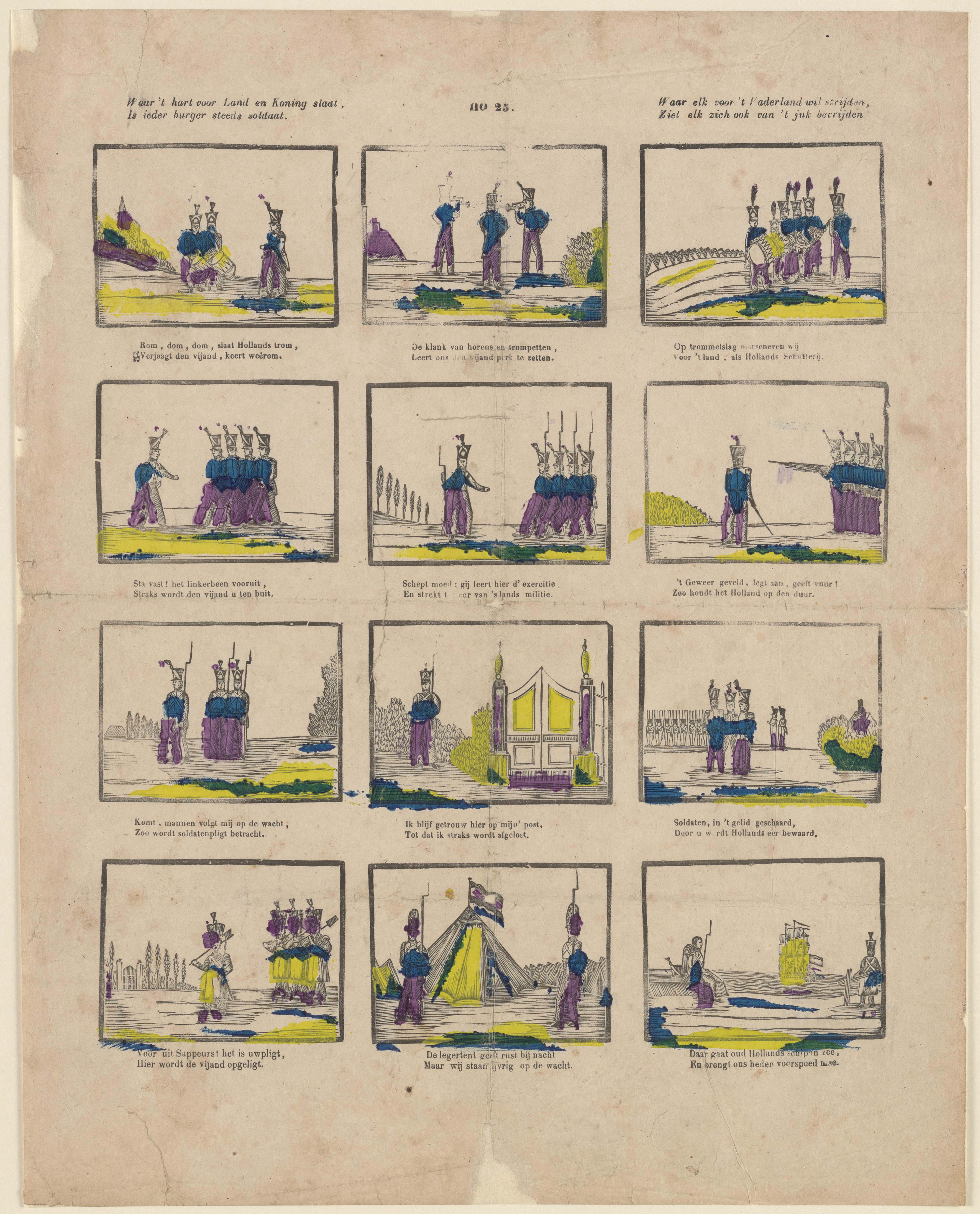 Prent met twaalf afbeeldingen van militairen, gedrukt met afzonderlijke houtsneden en ingekleurd met paars, geel en blauw. Elke afbeelding heeft een tweeregelig onderschrift. Op de prent is geen uitgever vermeld. Hij kan worden toegeschreven aan de uitgever Lutkie & Cranenburg in 's-Hertogenbosch.