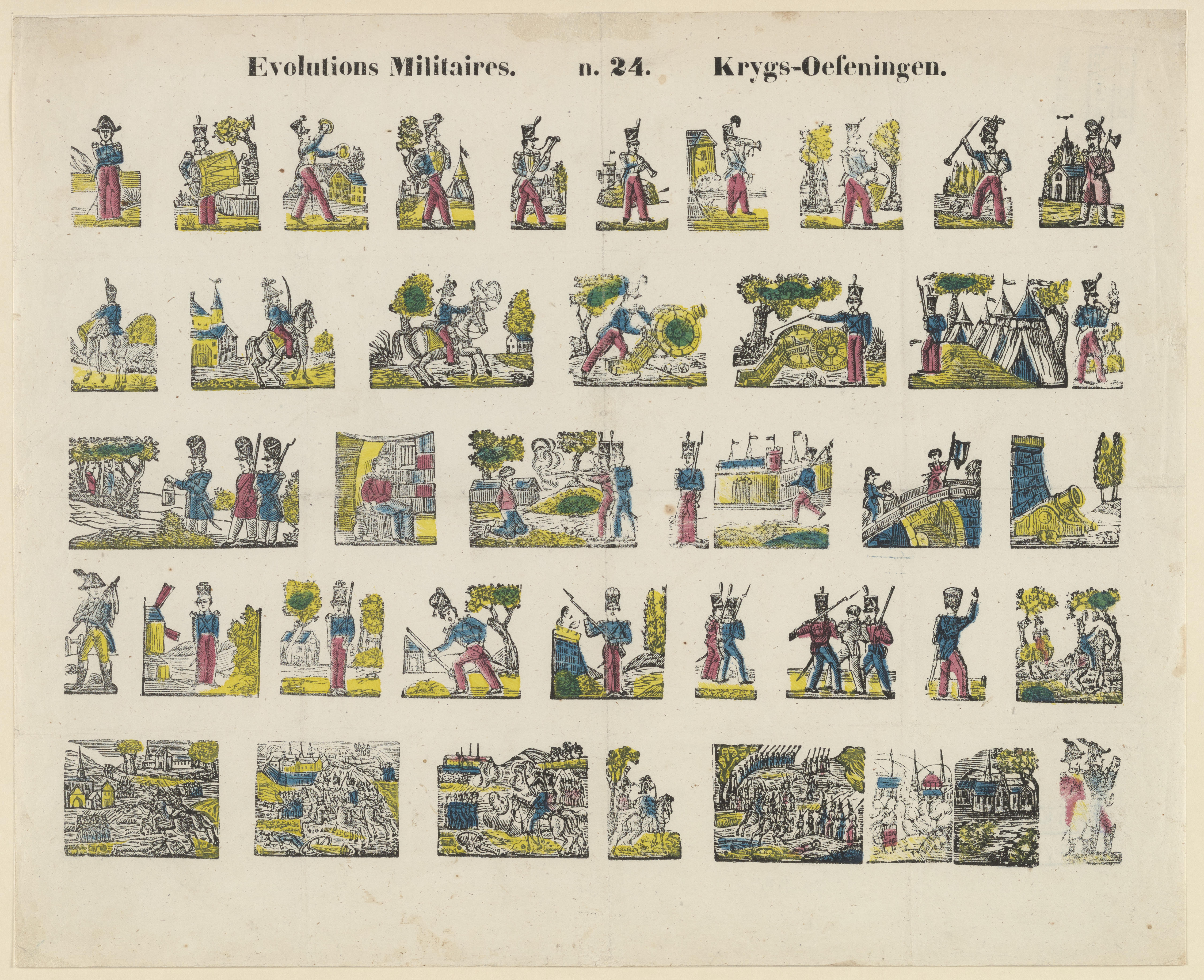 Prent met 41 afbeeldingen van militairen en militaire scènes. Op de prent is geen uitgever vermeld. De prent is gedrukt door de Turnhoutse uitgever Glenisson & van Genechten of zijn opvolger Glenisson & Zonen.