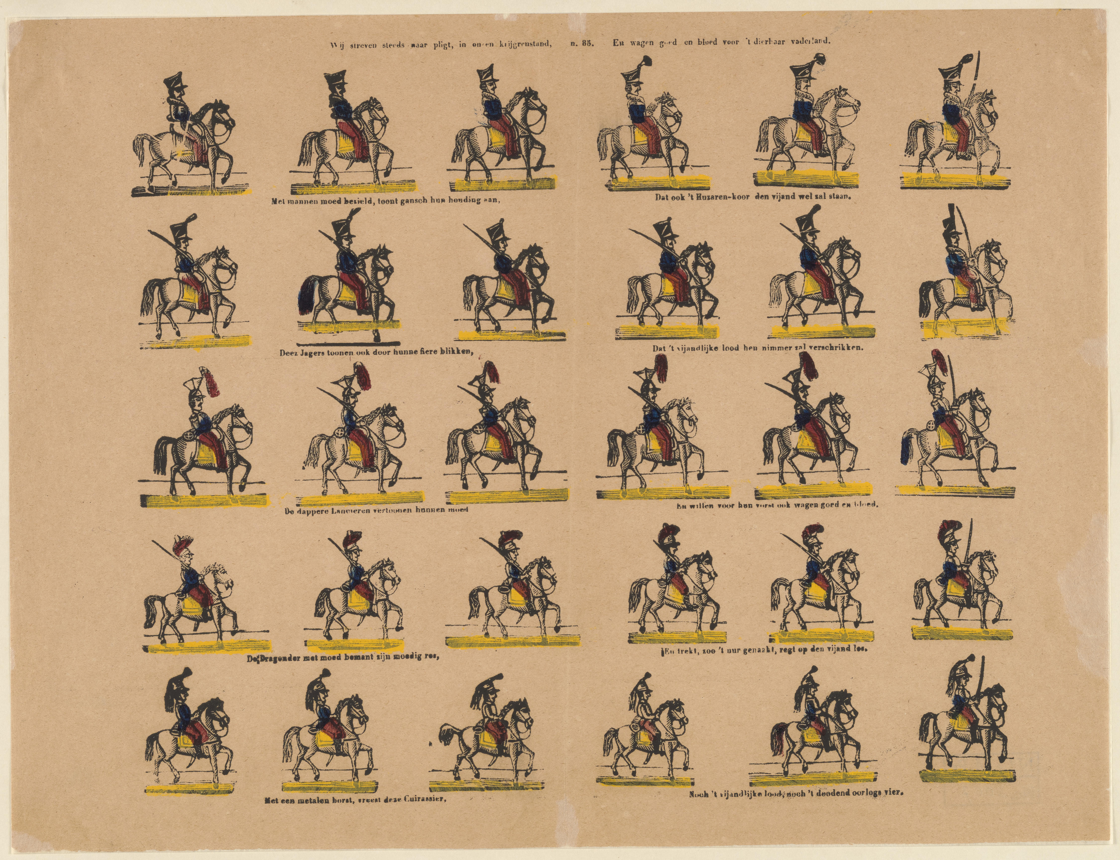 Prent met dertig voorstellingen van militairen te paard. Op de prent is geen uitgever vermeld. De prent is gedrukt door de Turnhoutse uitgever Glenisson & van Genechten of zijn opvolger Glenisson & Zonen.