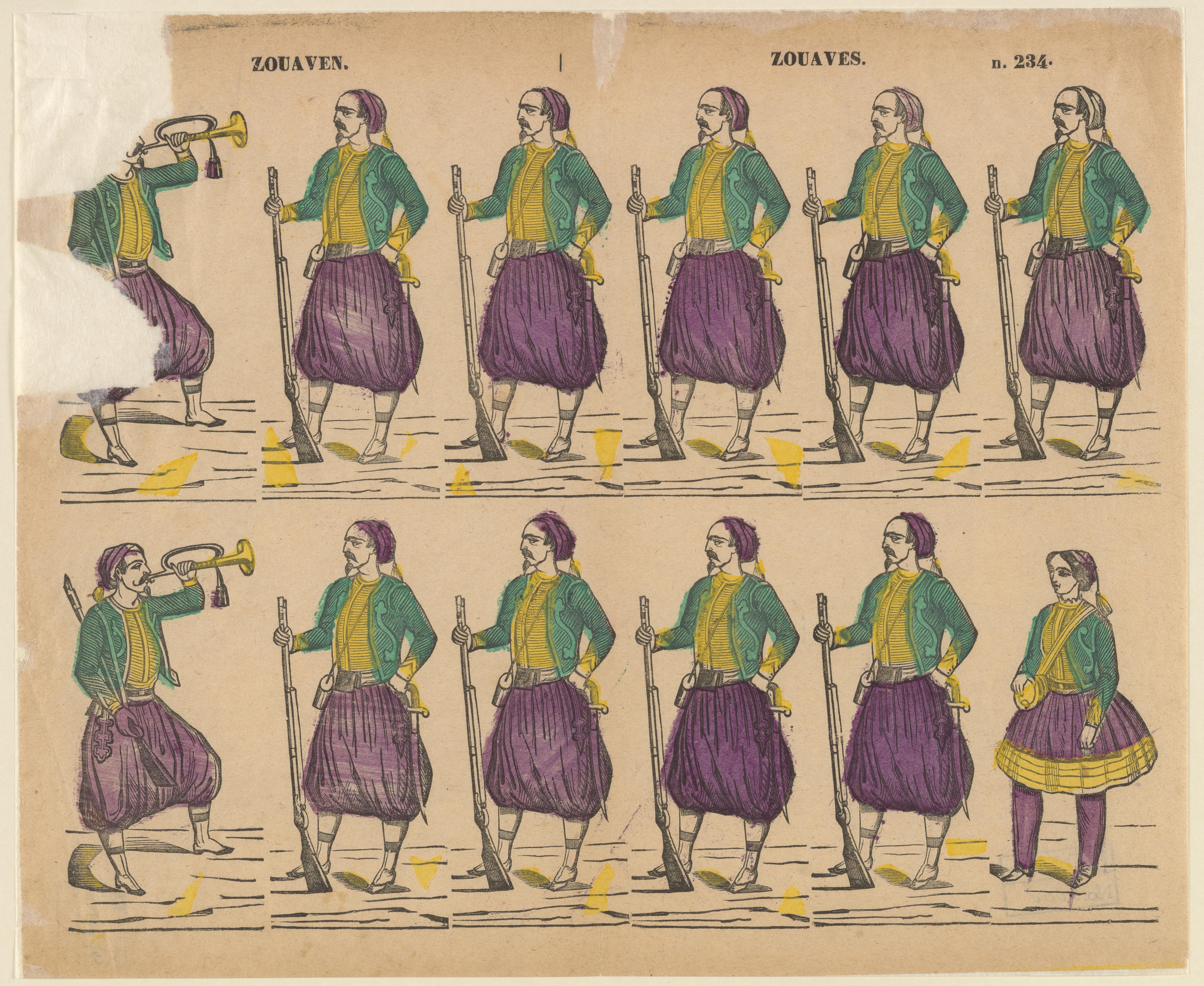Prent met elf Zouaven en een marketentster, gedrukt met twaalf afzonderlijke houtsneden en ingekleurd met paars, groen en geel. Op de prent is geen uitgever vermeld. Deze prent is uitgegeven door P.J. Brepols in Turnhout of door één van zijn opvolgers.