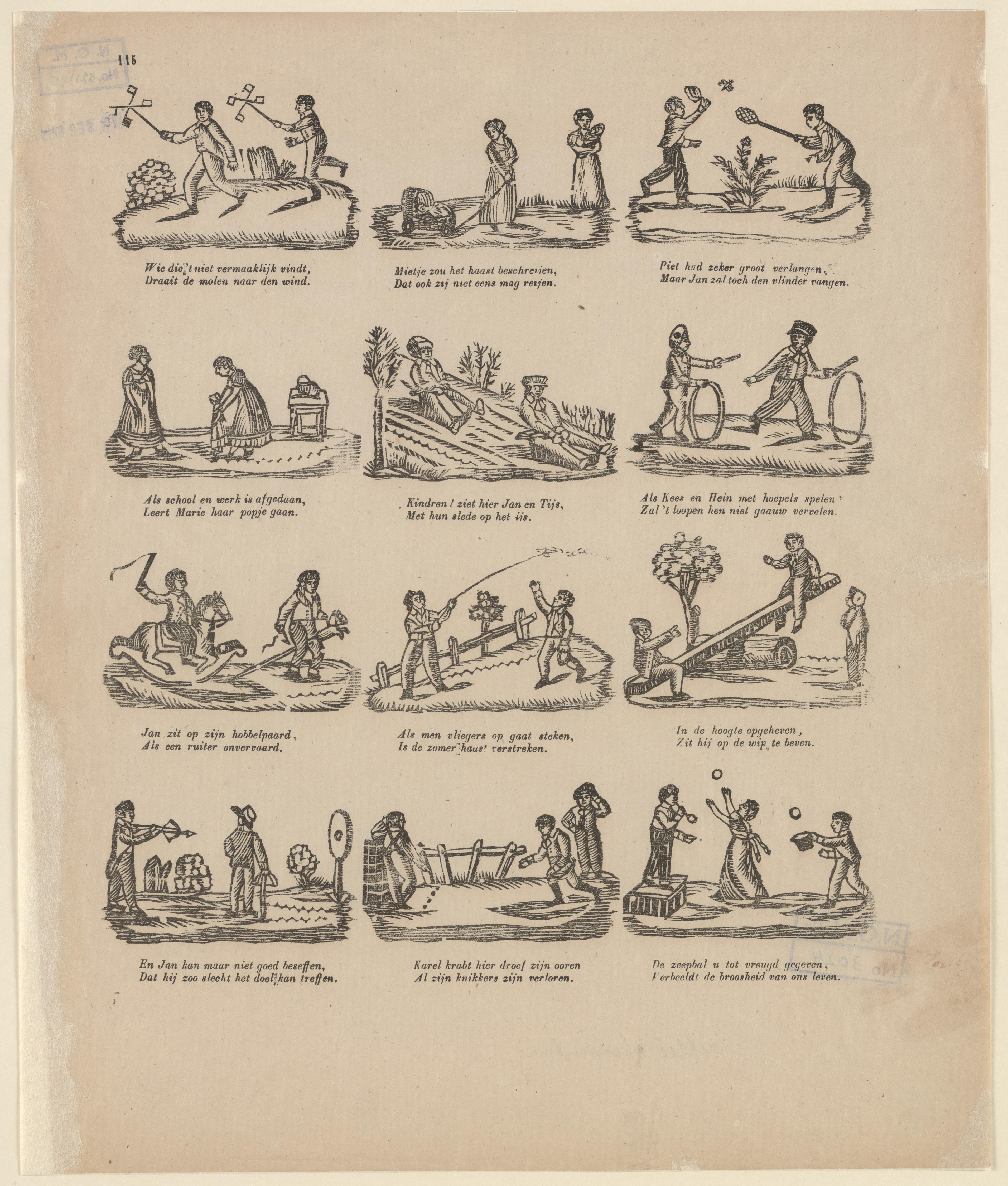 Prent met twaalf afbeeldingen van verschillende kinderspelen, gedrukt met afzonderlijke houtsneden. Onder iedere afbeelding staat een tweeregelig onderschrift. Op de prent is geen uitgever vermeld. Hij kan worden toegeschreven aan de uitgever Lutkie & Cranenburg in 's-Hertogenbosch.