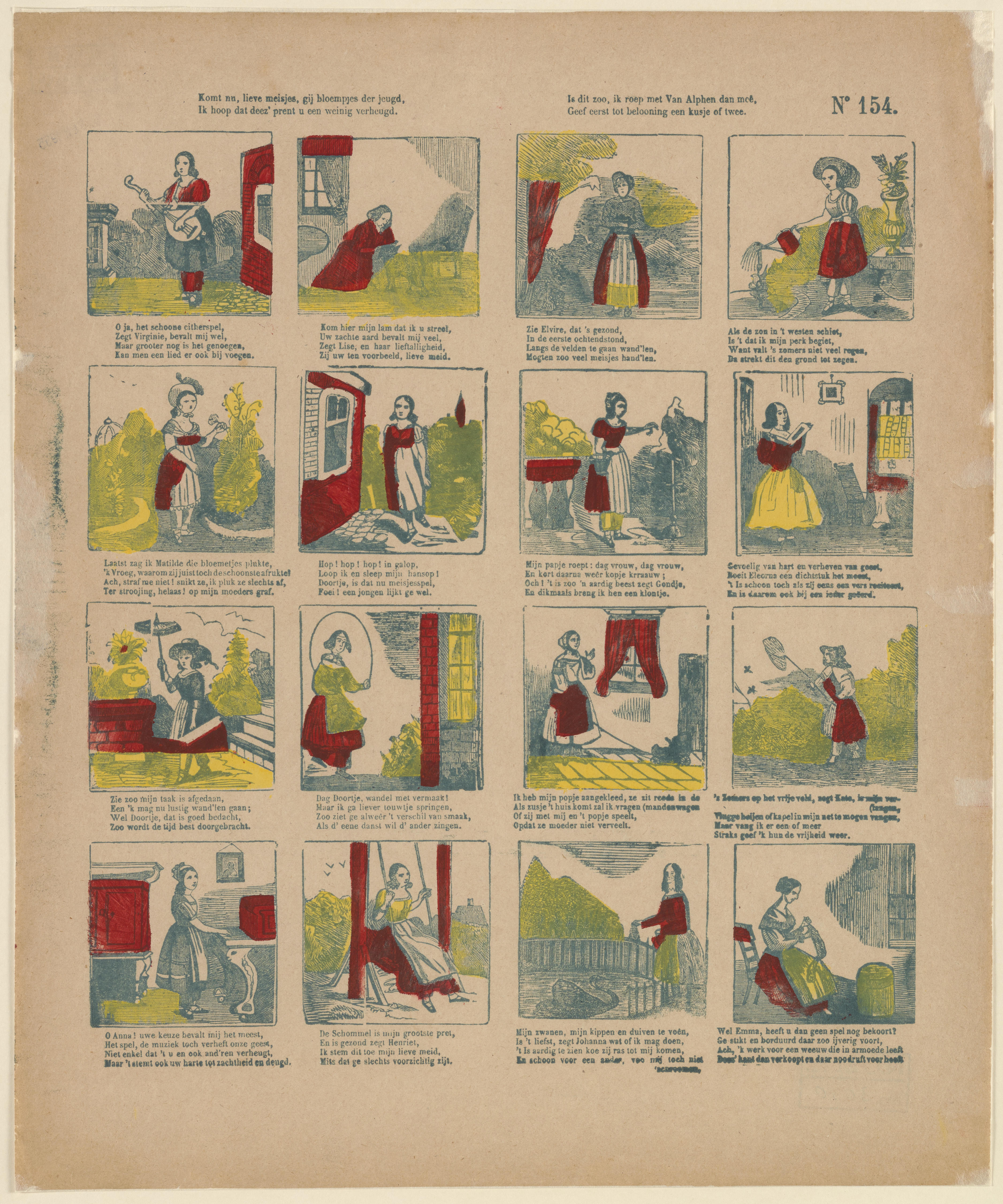 Prent met zestien afbeeldingen van meisjesspelen en -bezigheden, gedrukt met afzonderlijke houtsneden in blauw en ingekleurd met rood en geel. Onder elke afbeelding staat een vierregelig onderschrift, gedrukt in boekdruk. Op de prent staat geen uitgever vermeld. Hij is toegeschreven aan Hemeleers van Houter in Schaarbeek.
