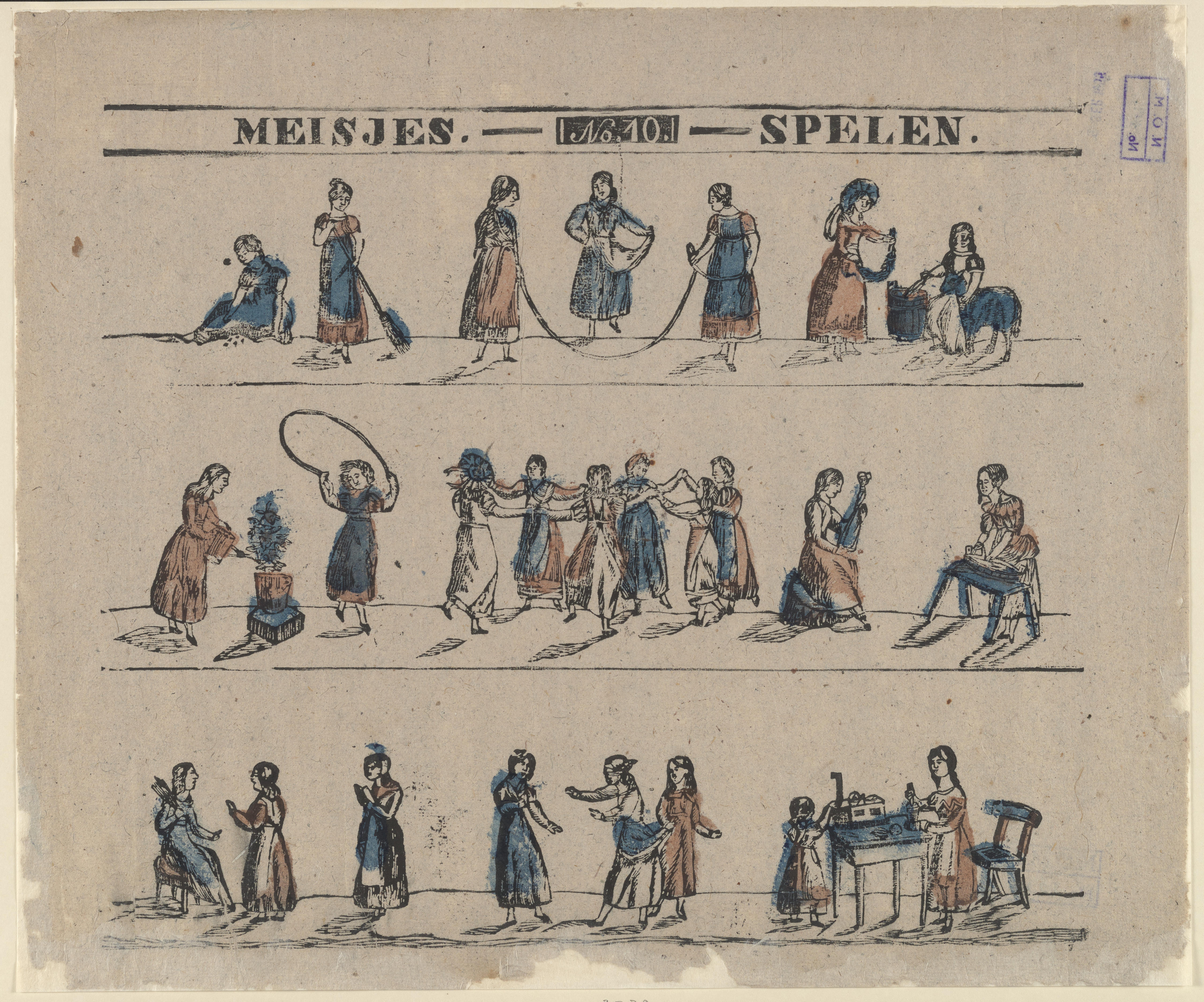 Prent met afbeeldingen van verschillende activiteiten voor meisjes, gedrukt met drie houtsneden en ingekleurd met rood en blauw. De prent heeft geen uitgeversadres, maar kan worden toegeschreven aan Mindermann & Co. in Amsterdam.