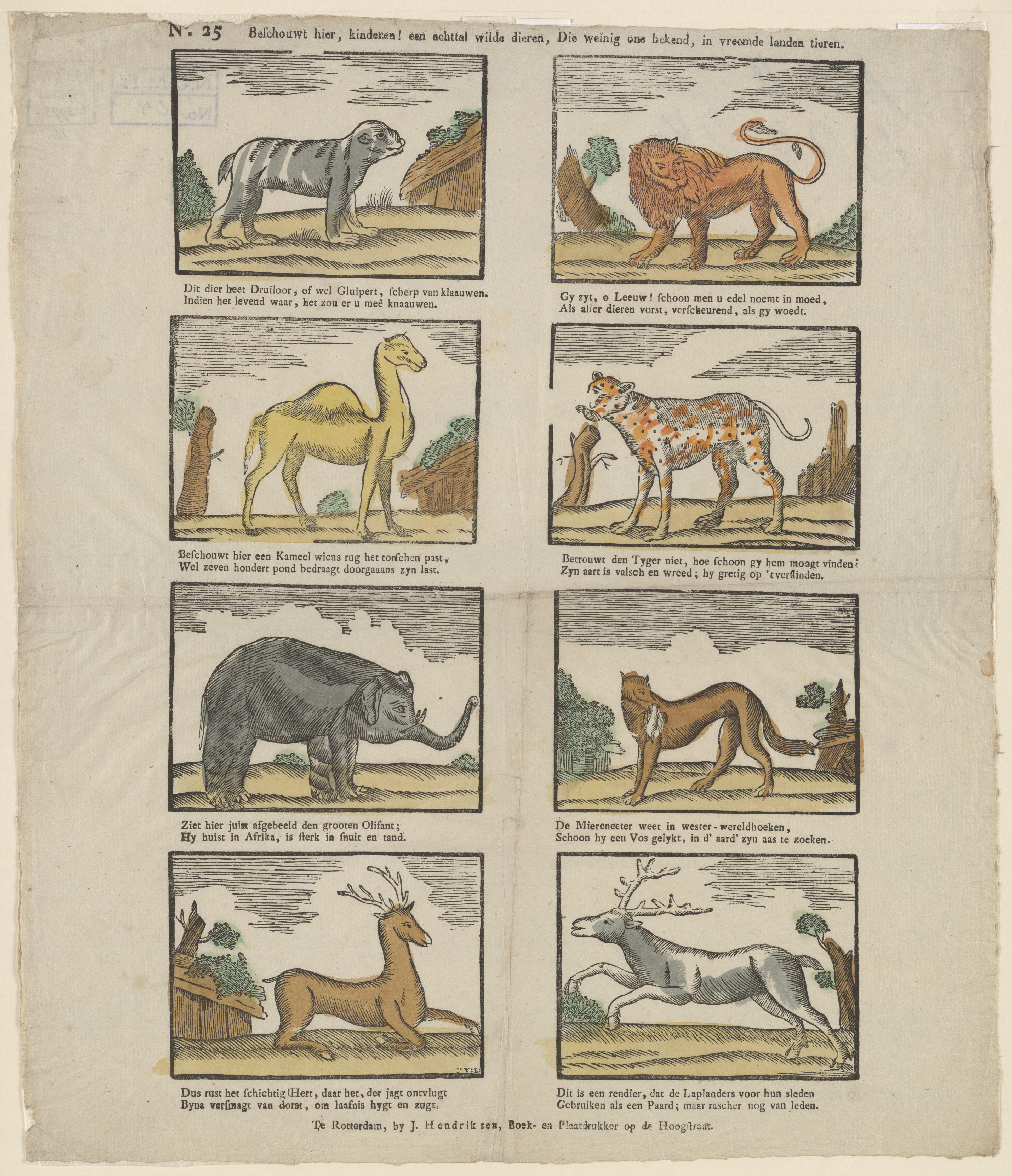 Prent met acht afbeeldingen van wilde dieren, waarbij het eerste dier van een niet-bestaande diersoort is en de dromedaris op de derde afbeelding een kameel genoemd wordt. De prent is gedrukt met acht afzonderlijke houtsneden en ingekleurd met grijs, bruin, oranje, groen en geel. Onder iedere afbeelding staat een tweeregelig onderschrift. In de afbeelding linksonder ...