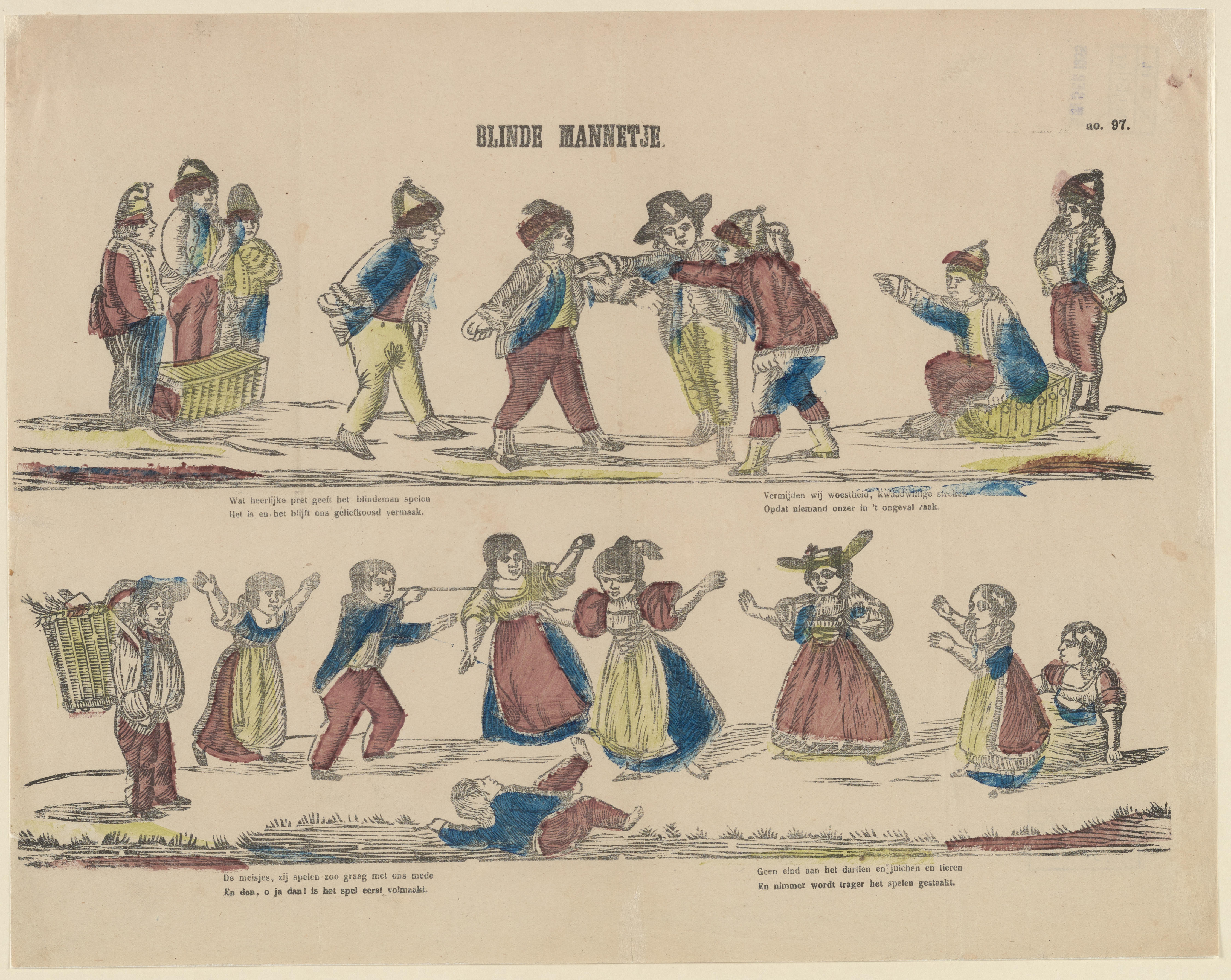Prent met twee afbeeldingen van spelende kinderen, gedrukt met afzonderlijke houtsneden en ingekleurd met blauw, geel en rood. Onder beide afbeeldingen staat twee keer een tweeregelig onderschrift. Op de prent is geen uitgever vermeld. Hij kan worden toegeschreven aan de uitgever Lutkie & Cranenburg in 's-Hertogenbosch.