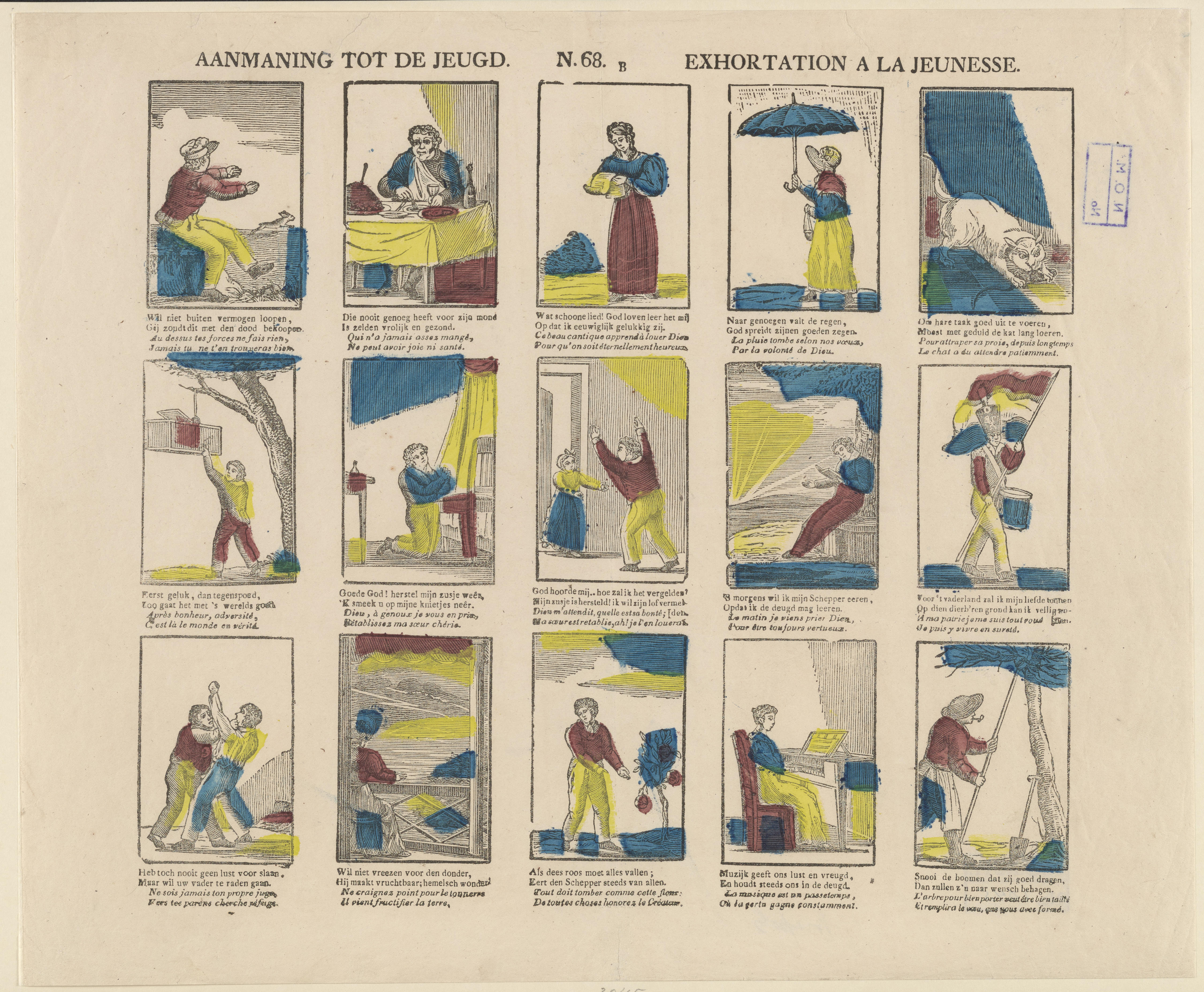 Prent met allerlei personages en bezigheden, gedrukt met vijftien afzonderlijke houtsneden en ingekleurd met rood, geel en blauw. Op de prent is geen uitgever vermeld. Deze prent is uitgegeven door P.J. Brepols in Turnhout of door één van zijn opvolgers.