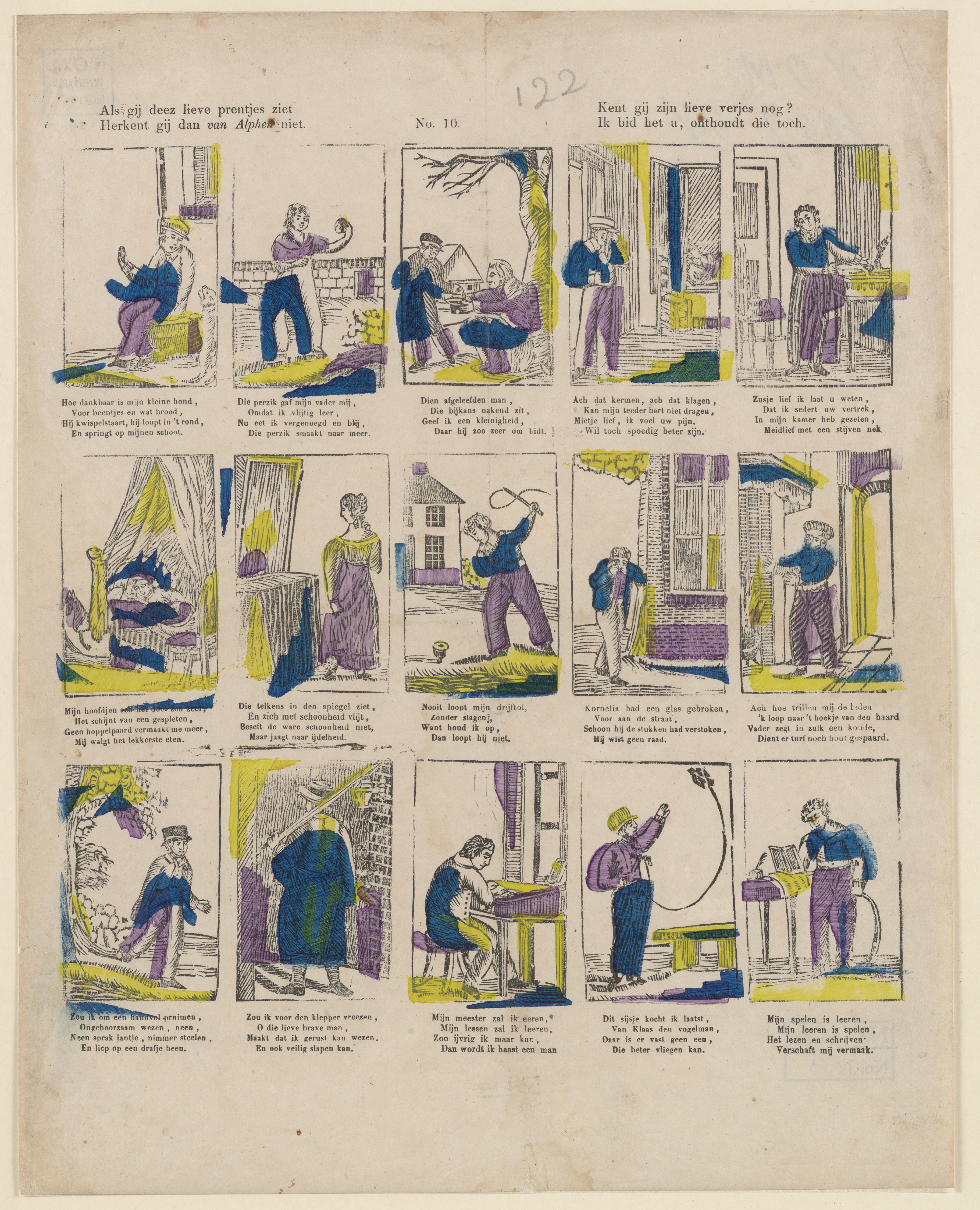 Prent met vijftien moraliserende taferelen. De voorstellingen en onderschriften zijn geïnspireerd op Hieronymus van Alphens 'Kleine gedichten voor kinderen'. Onder elke afbeelding staat een vierregelig vers. De prent is gedrukt met afzonderlijke houtsneden en ingekleurd met blauw, geel en paars. Op de prent is geen uitgever vermeld. Hij kan worden toegeschreven aan de uitgever Lutkie ...