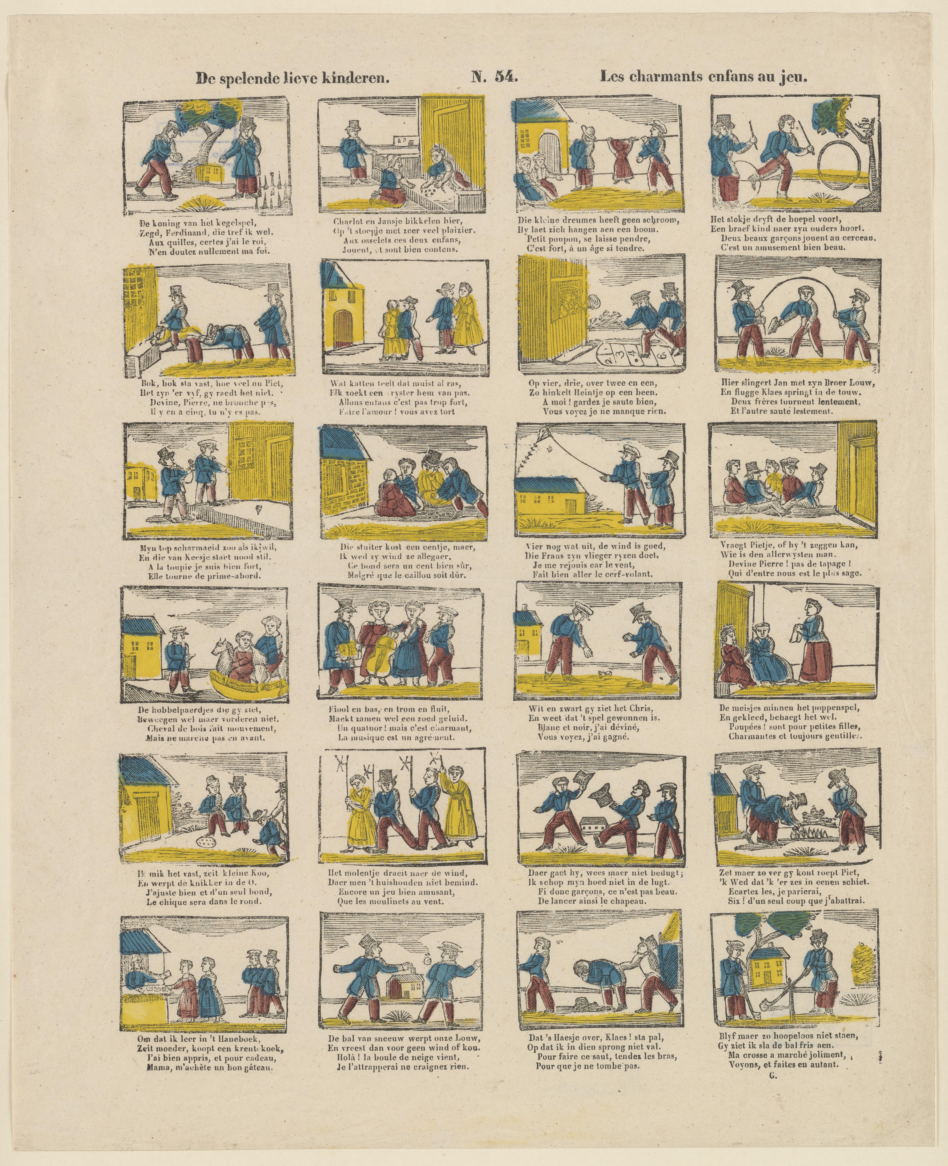Prent met 24 afbeeldingen van verschillende kinderspelen. Onder elke afbeelding staat een tweeregelig onderschrift in het Nederlands en het Frans. Rechtsonder staat de signatuur 'G', een verwijzing naar de Turnhoutse uitgever Glenisson & van Genechten of zijn opvolger Glenisson & Zonen.