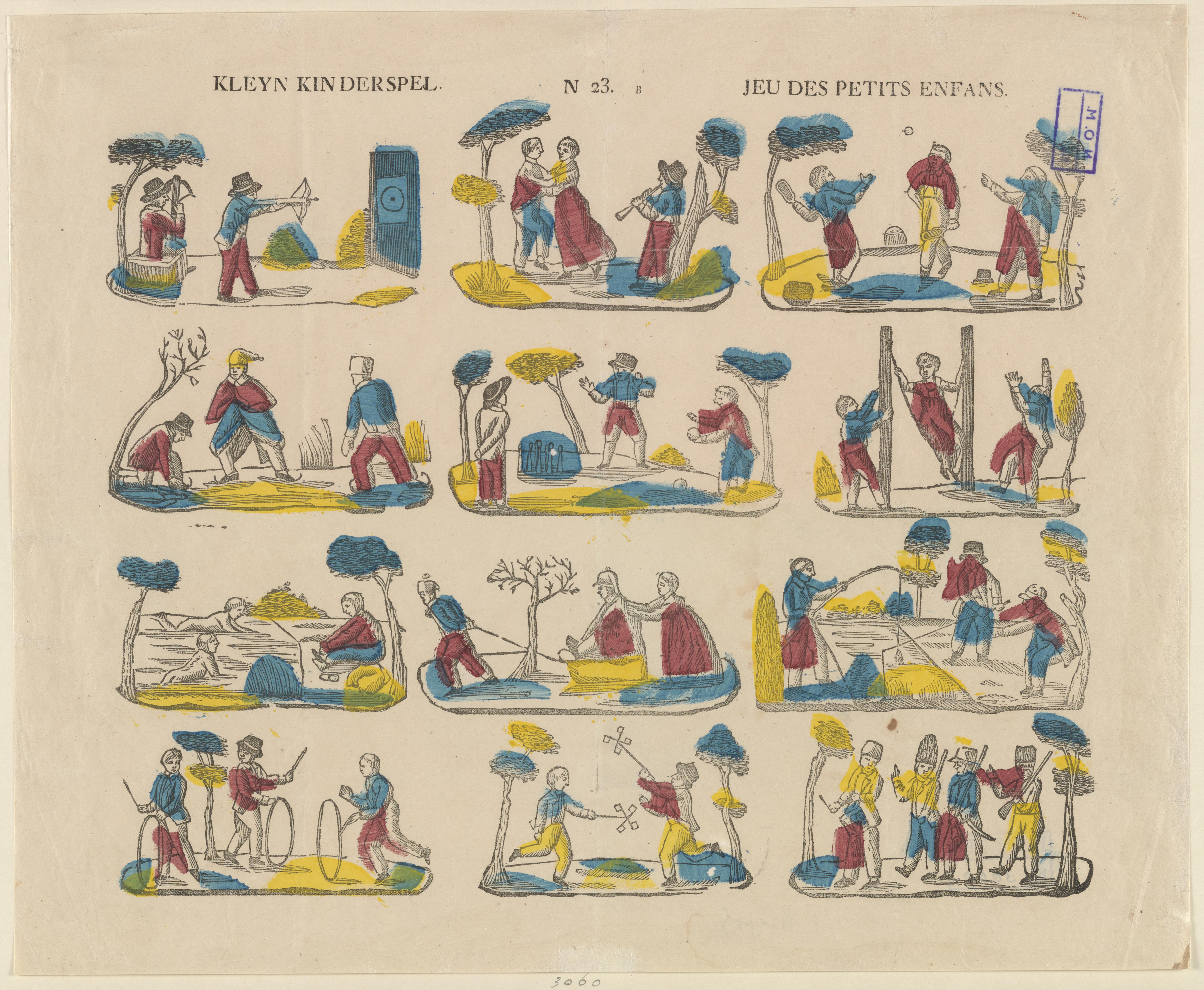 Prent met diverse kinderspelen, gedrukt met twaalf afzonderlijke houtsneden en ingekleurd met rood, blauw en geel. Op de prent is geen uitgever vermeld. Deze prent is uitgegeven door P.J. Brepols in Turnhout of door één van zijn opvolgers.