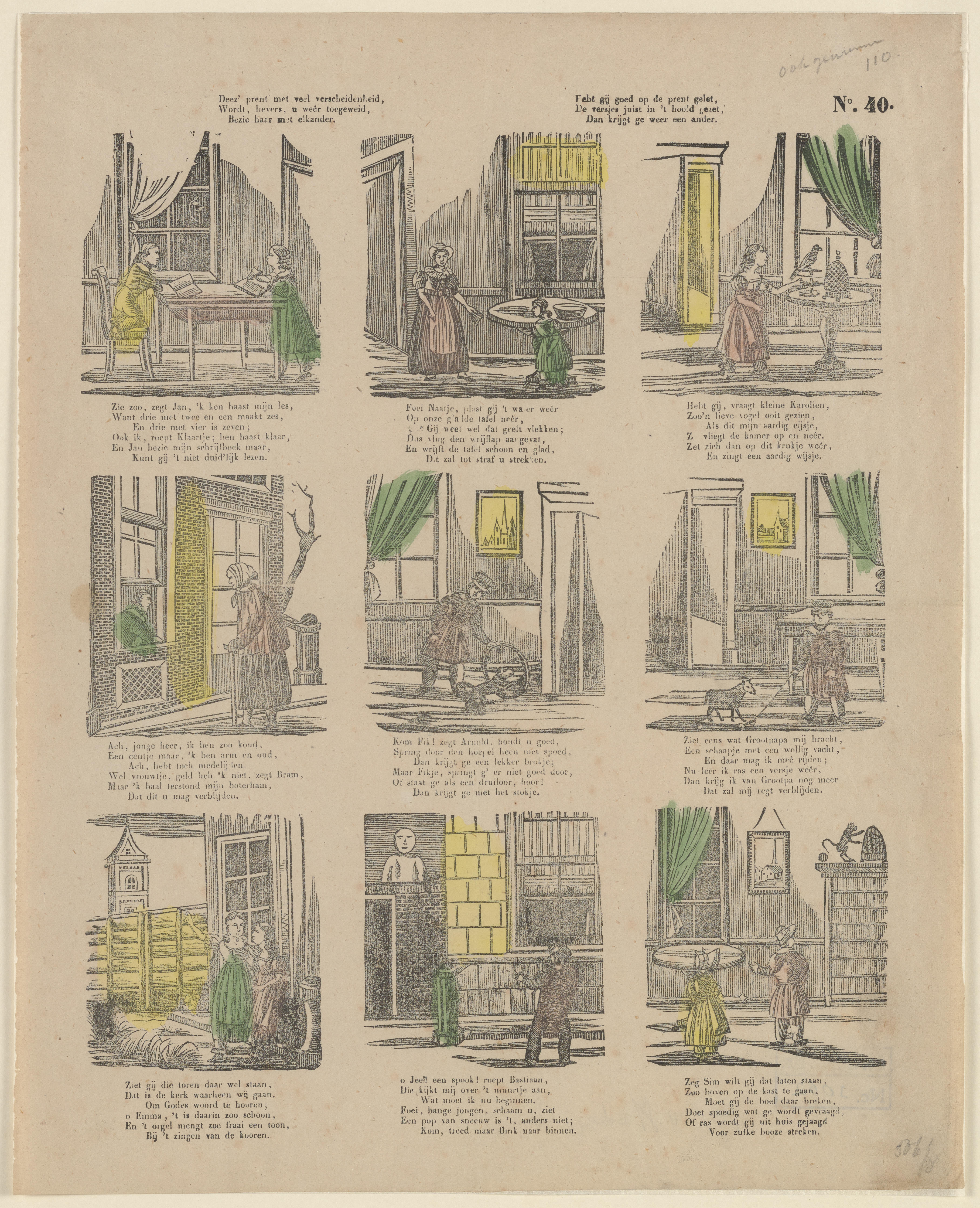 Deez' prent met veel verscheidenheid / Wordt lievers u weêr toegewijd, / Bezie haar met elkander // Hebt gij goed op de prent gelet, / De versjes juist in 't hoofd gezet, / Dan krijgt ge weer een ander. - No. 40