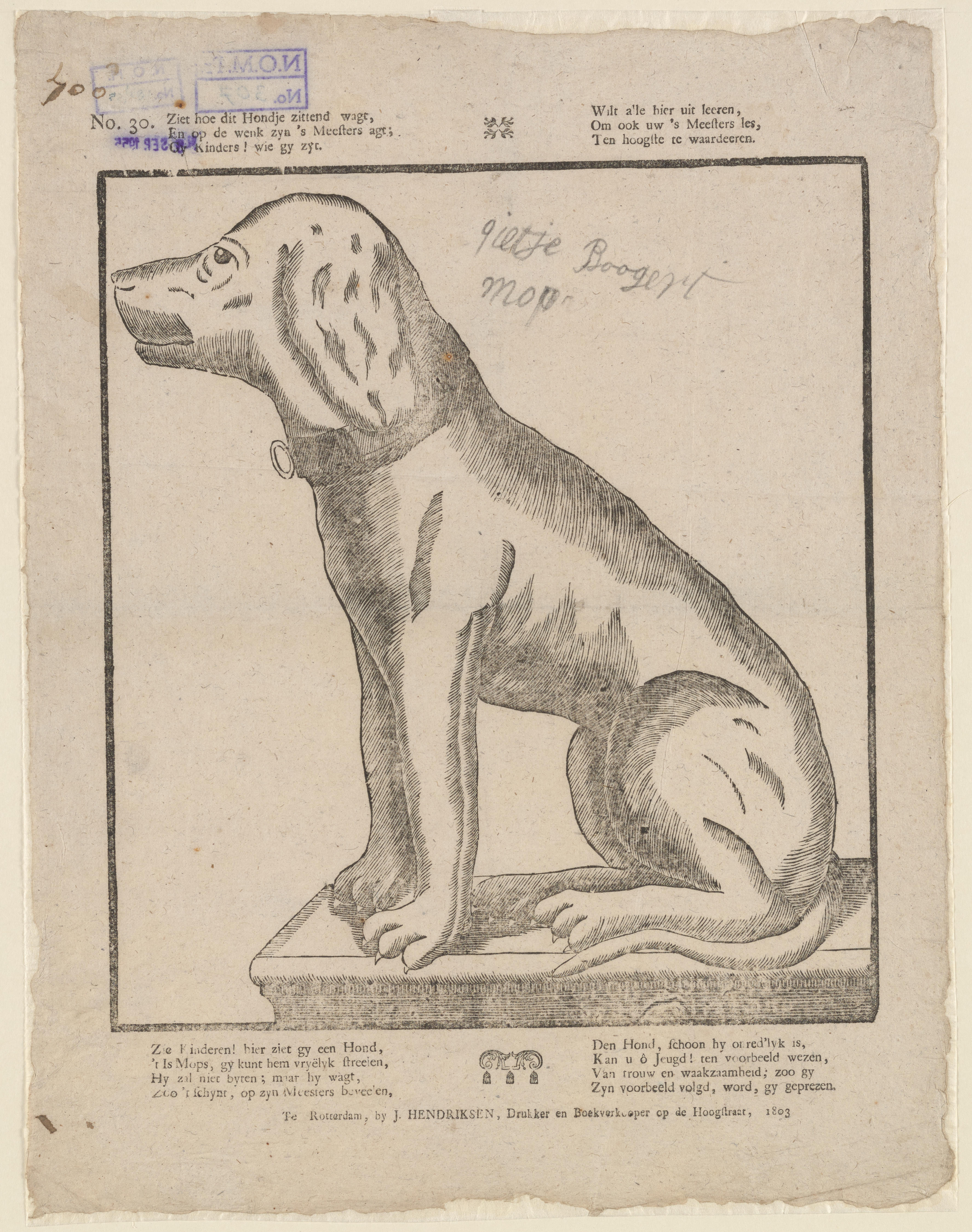 Prent met een afbeelding van een zittende hond, gedrukt met een houtsnede. Boven de afbeelding staat twee keer een drieregelig vers; onder de afbeelding staat twee keer een vierregelig vers. De prent heeft de datering 1803. Met potlood is op de prent geschreven: 'Gietje Boogert, mop'.