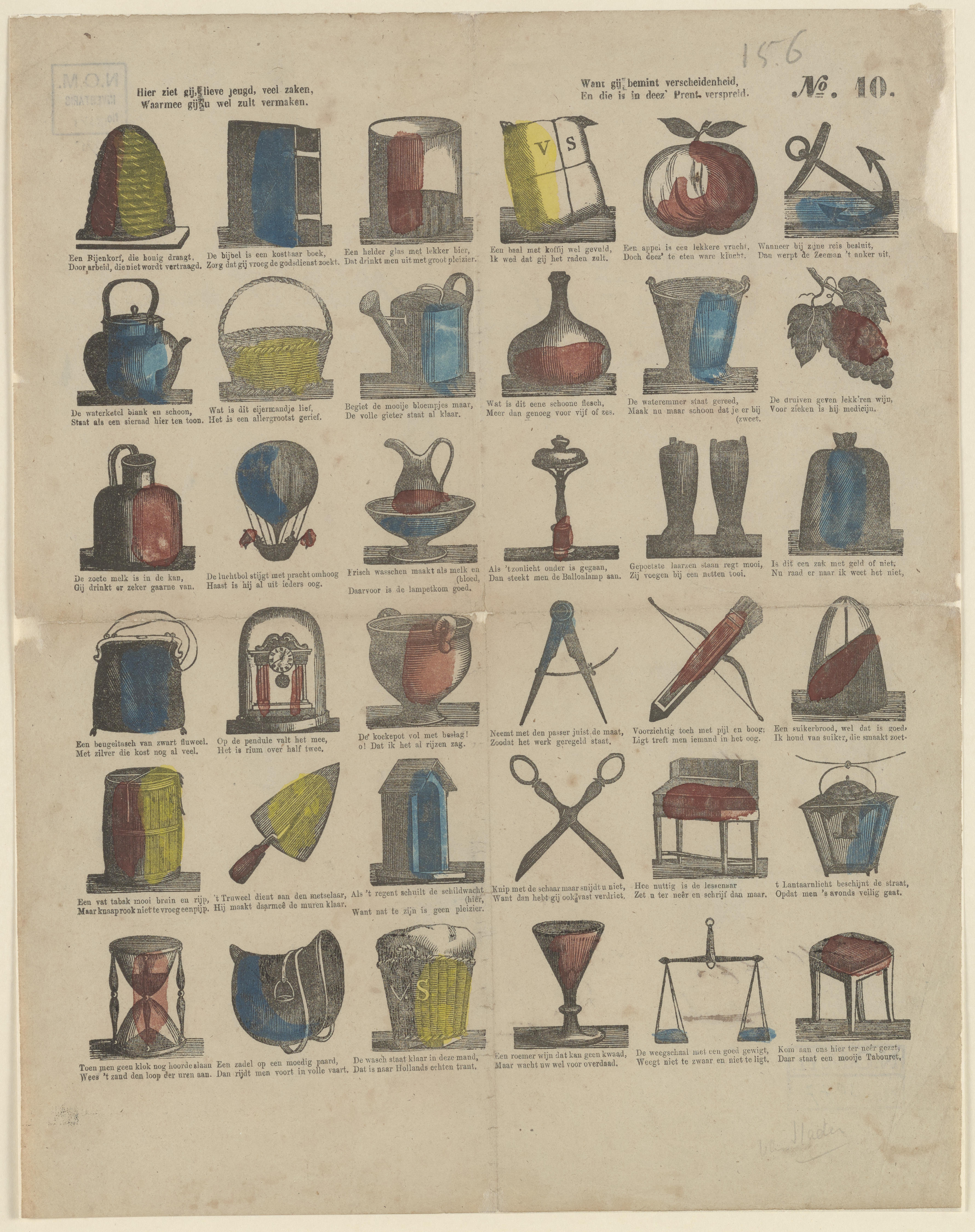 Hier ziet gij lieve jeugd, veel zaken, / Waarmee gij u wel zult vermaken. // Want gij bemint verscheidenheid. / En die is in deez' Prent verspreid. - No. 10