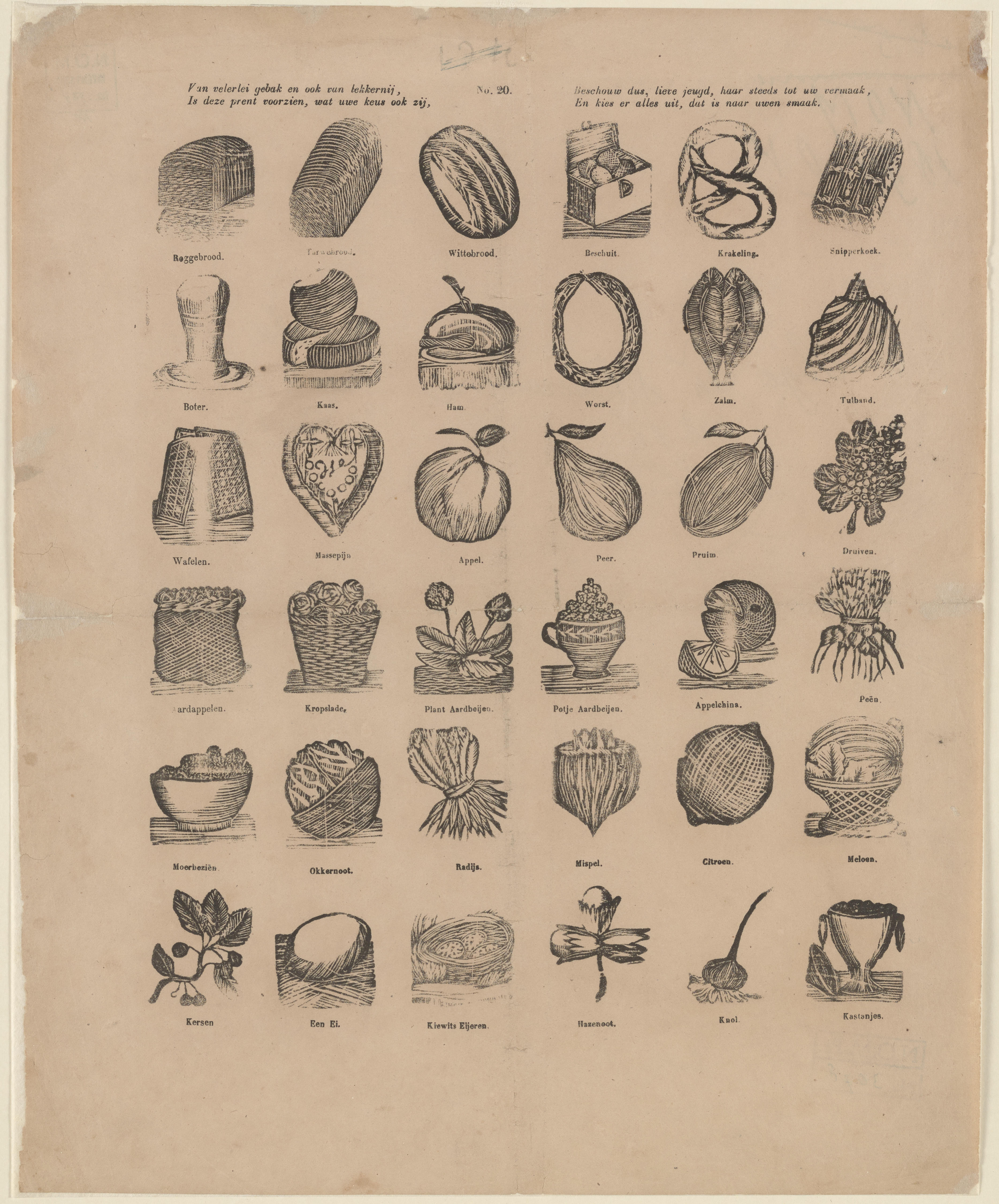 Prent met 36 afbeeldingen van groente, fruit en etenswaren, gedrukt met afzonderlijke houtsneden. Onder iedere afbeelding staat een onderschrift. Op de prent is geen uitgever vermeld. Hij kan worden toegeschreven aan de uitgever Lutkie & Cranenburg in 's-Hertogenbosch.