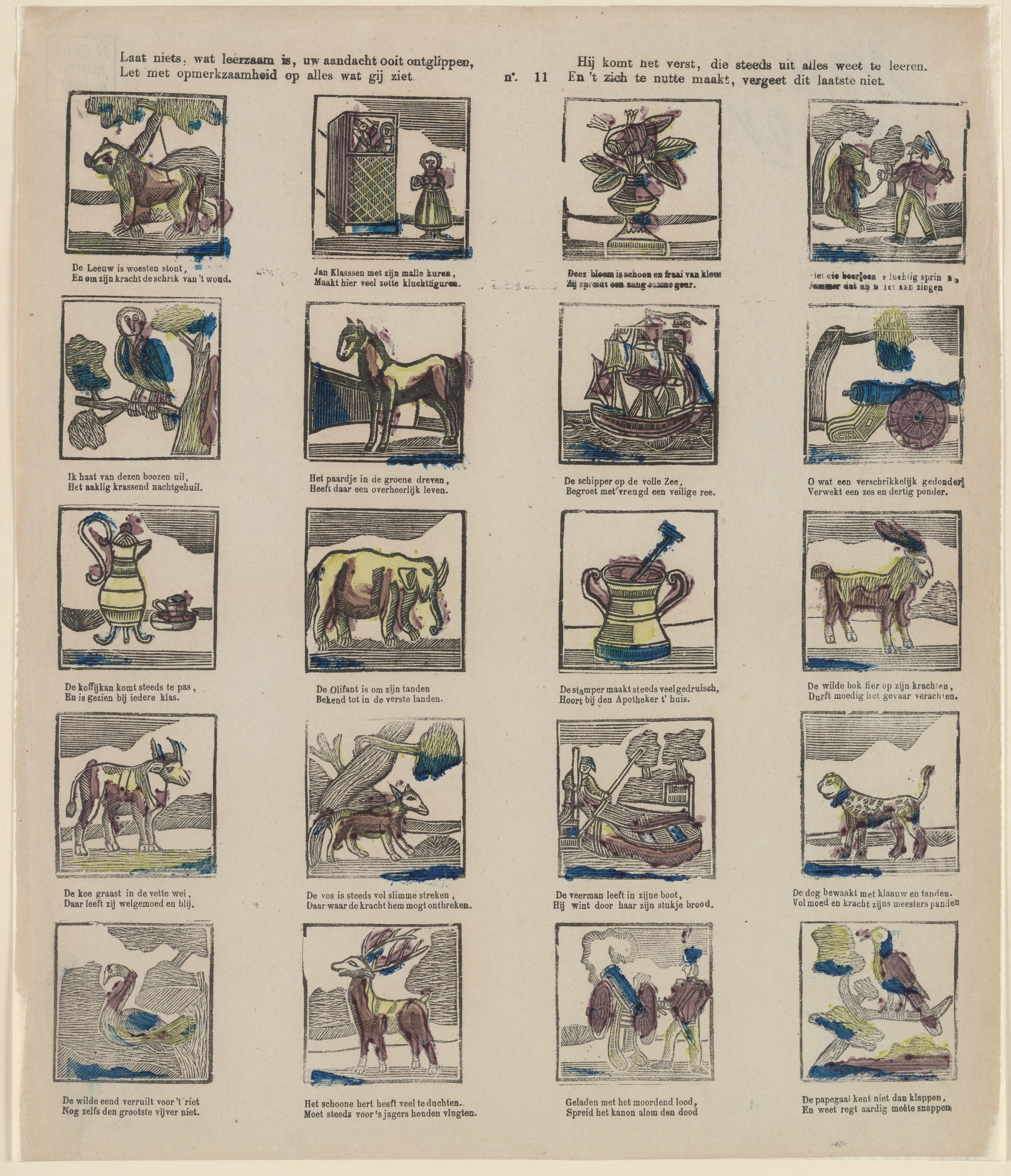 Prent met twintig afbeeldingen van verschillende dieren en voorwerpen, gedrukt met afzonderlijke houtsneden en ingekleurd met rood, geel en blauw. Onder elke afbeelding staat een tweeregelig onderschrift. Op de prent is geen uitgever vermeld. Hij kan worden toegeschreven aan de uitgever Lutkie & Cranenburg in 's-Hertogenbosch.
