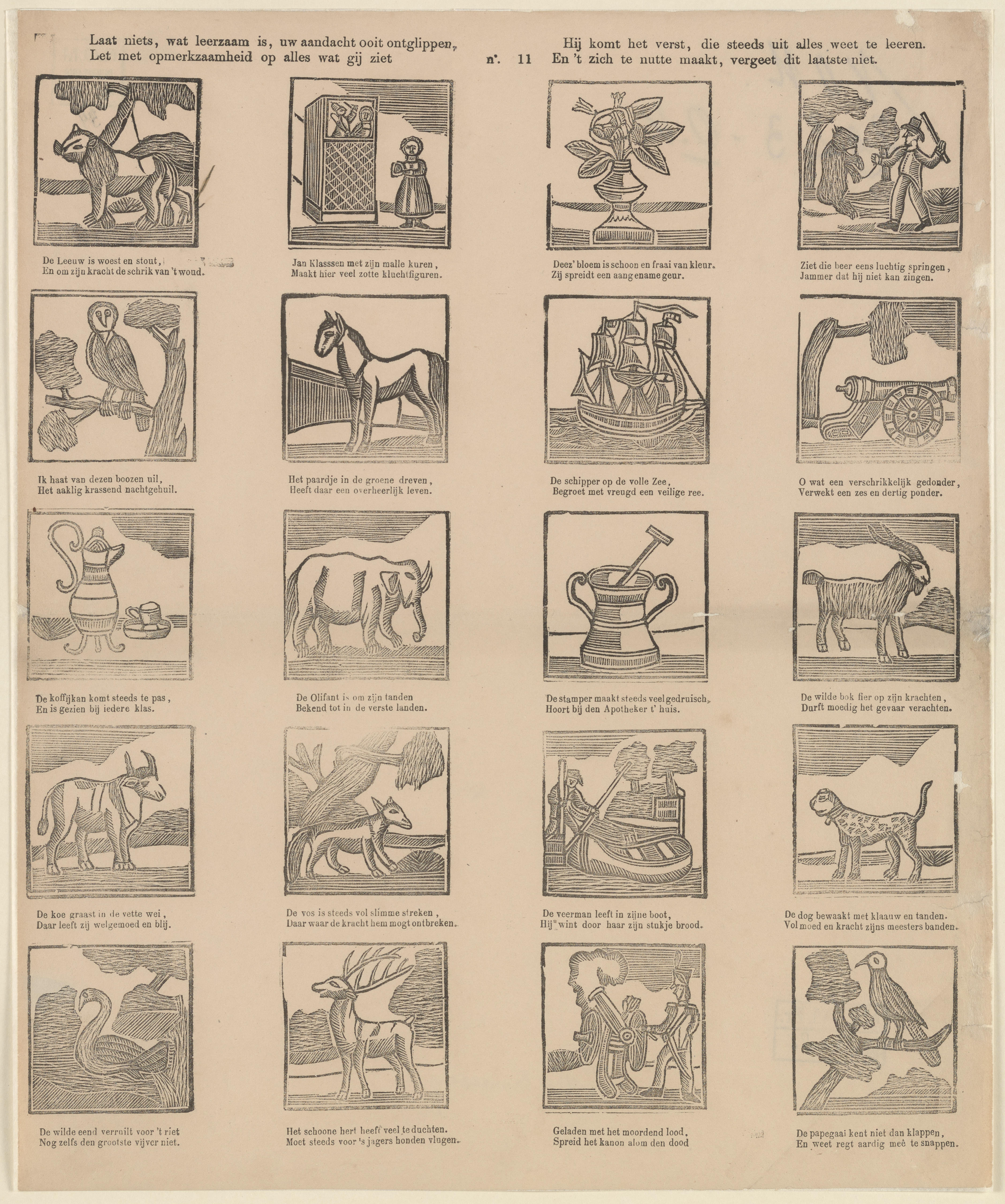 Prent met twintig afbeeldingen van verschillende dieren en voorwerpen, gedrukt met afzonderlijke houtsneden. Onder elke afbeelding staat een tweeregelig onderschrift. Op de prent is geen uitgever vermeld. Hij kan worden toegeschreven aan de uitgever Lutkie & Cranenburg in 's-Hertogenbosch.