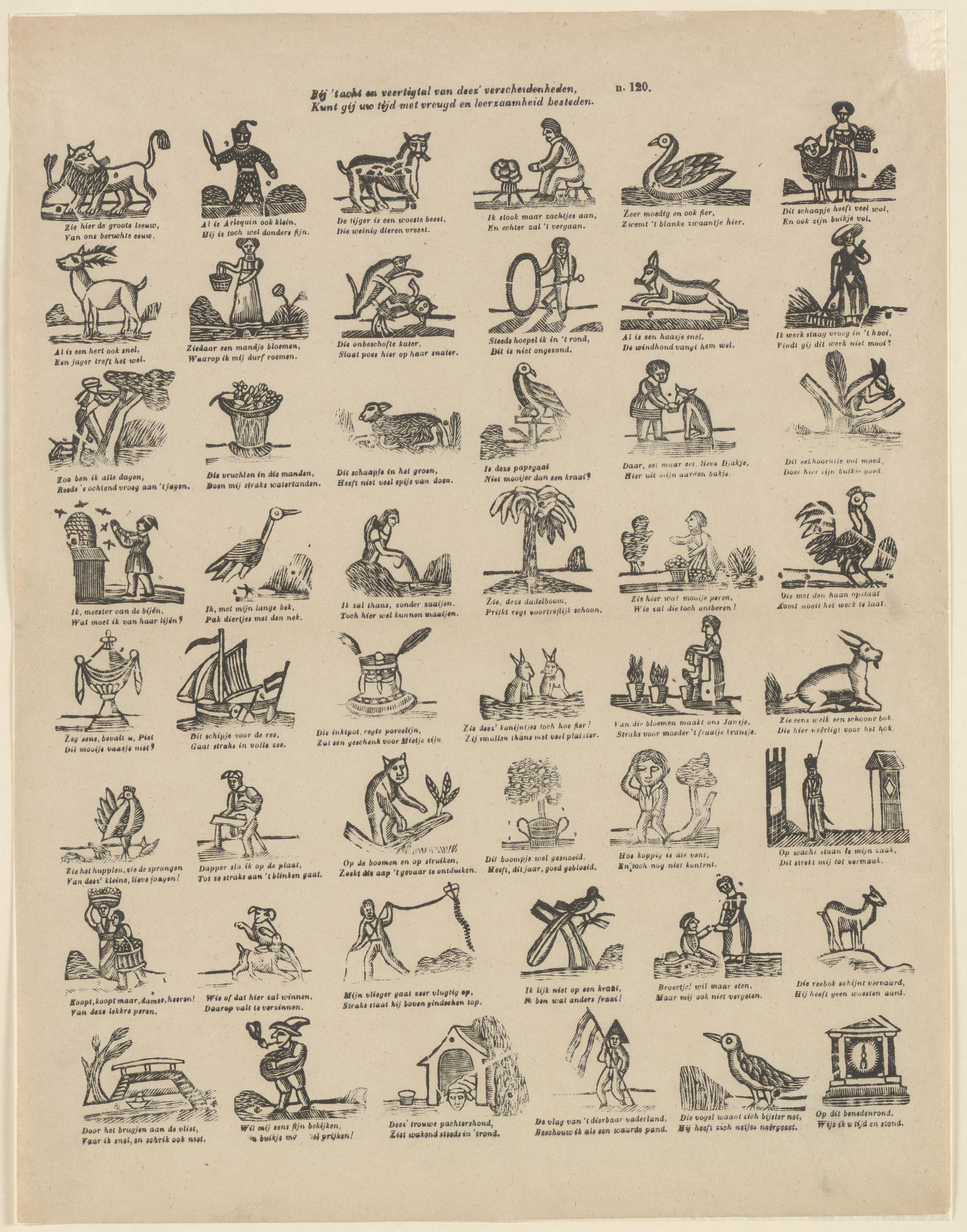 Prent met 48 afbeeldingen van allerlei personages, dieren en voorwerpen. Op de prent is geen uitgever vermeld. De prent is toegeschreven aan de Turnhoutse uitgever Glenisson & van Genechten of zijn opvolger Glenisson & Zonen.