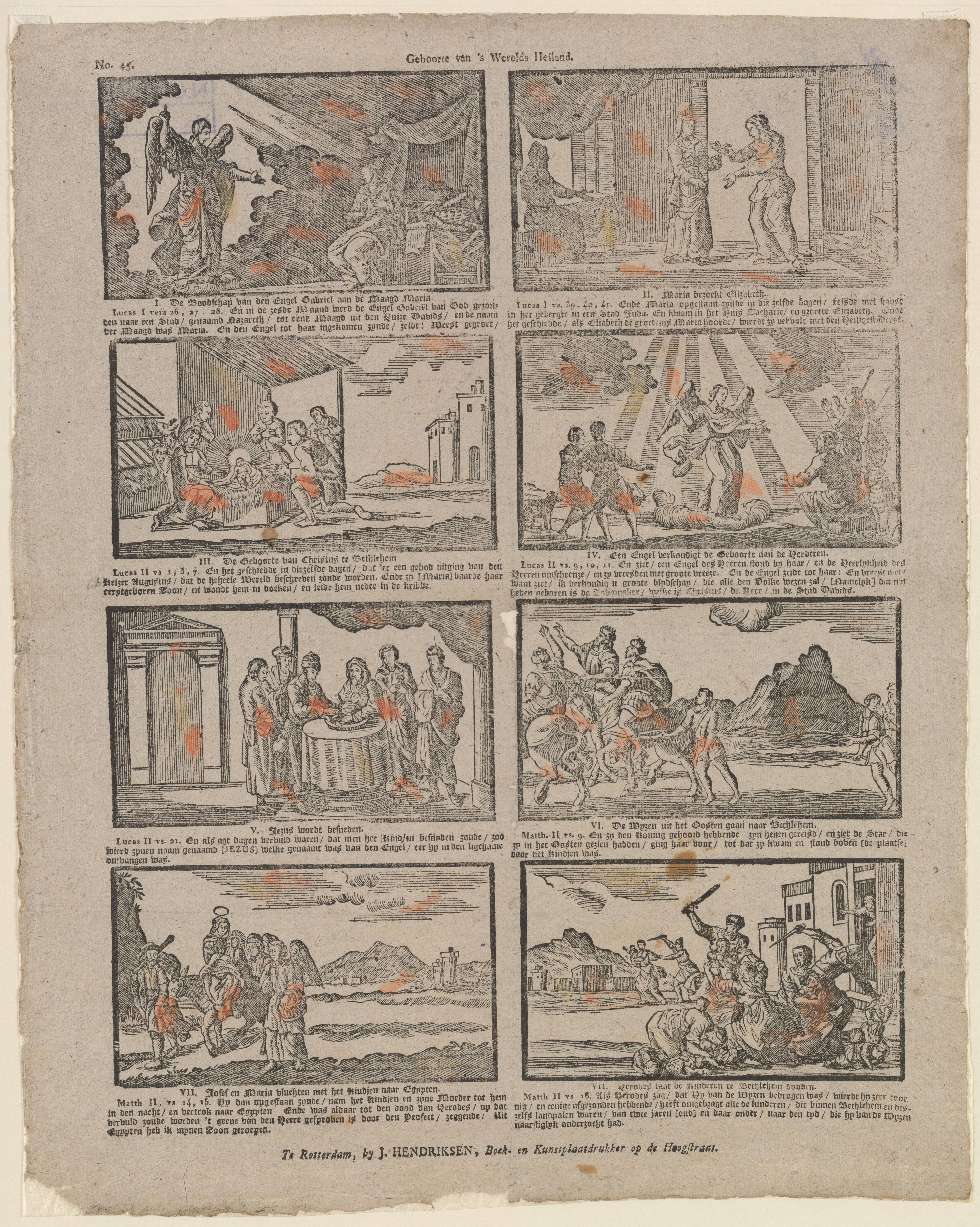 Prent met acht voorstellingen uit het Nieuwe Testament: de verkondiging van de engel aan Maria; het bezoek van Maria aan Elizabeth; de geboorte van Jezus; de verkondiging aan de herders; de besnijdenis van Jezus; de Wijzen uit het oosten onderweg naar Bethlehem; Jozef en Maria vluchten naar Egypte en de kindermoord te Bethlehem. De prent ...