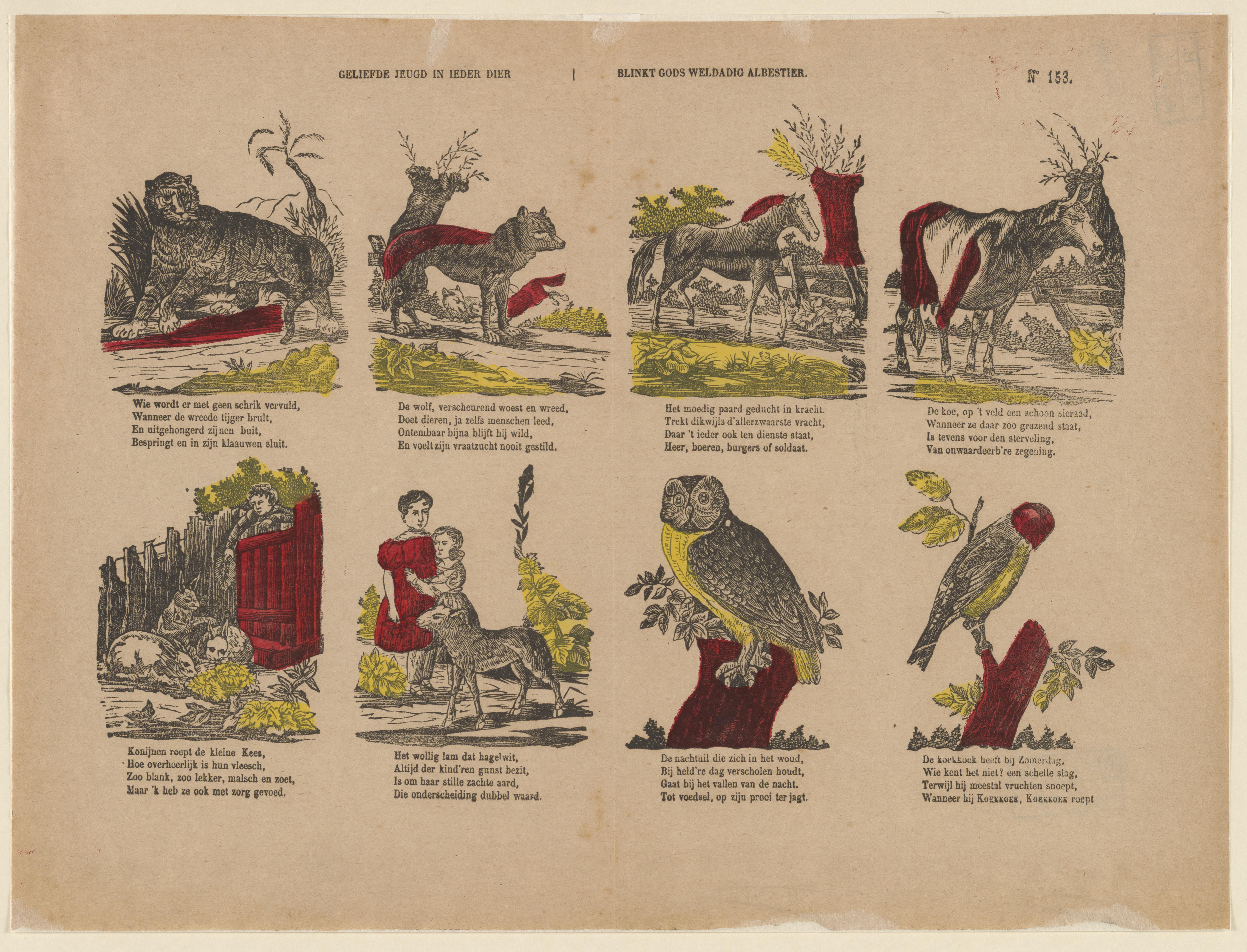 Prent met acht afbeeldingen van verschillende dieren, gedrukt met afzonderlijke houtsneden en ingekleurd met geel en rood. Onder elke afbeelding staat een onderschrift, gedrukt in boekdruk. Op de prent staat geen uitgever vermeld. Hij is toegeschreven aan Hemeleers van Houter in Schaarbeek.