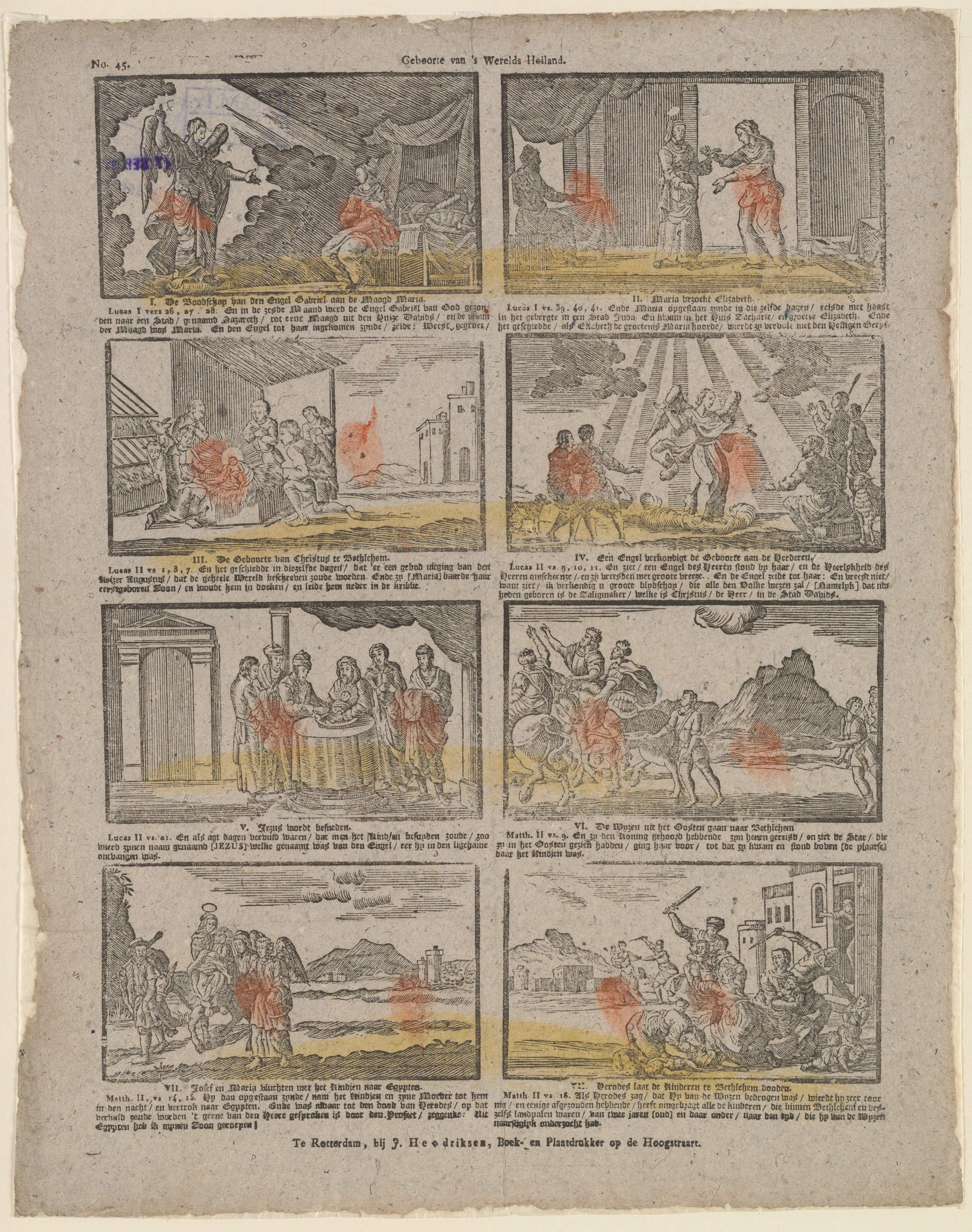 Prent met acht voorstellingen uit het Nieuwe Testament: de verkondiging van de engel aan Maria; het bezoek van Maria aan Elizabeth; de geboorte van Jezus; de verkondiging aan de herders; de besnijdenis van Jezus; de Wijzen uit het oosten onderweg naar Bethlehem; Jozef en Maria vluchten naar Egypte en de kindermoord te Bethlehem. De prent ...