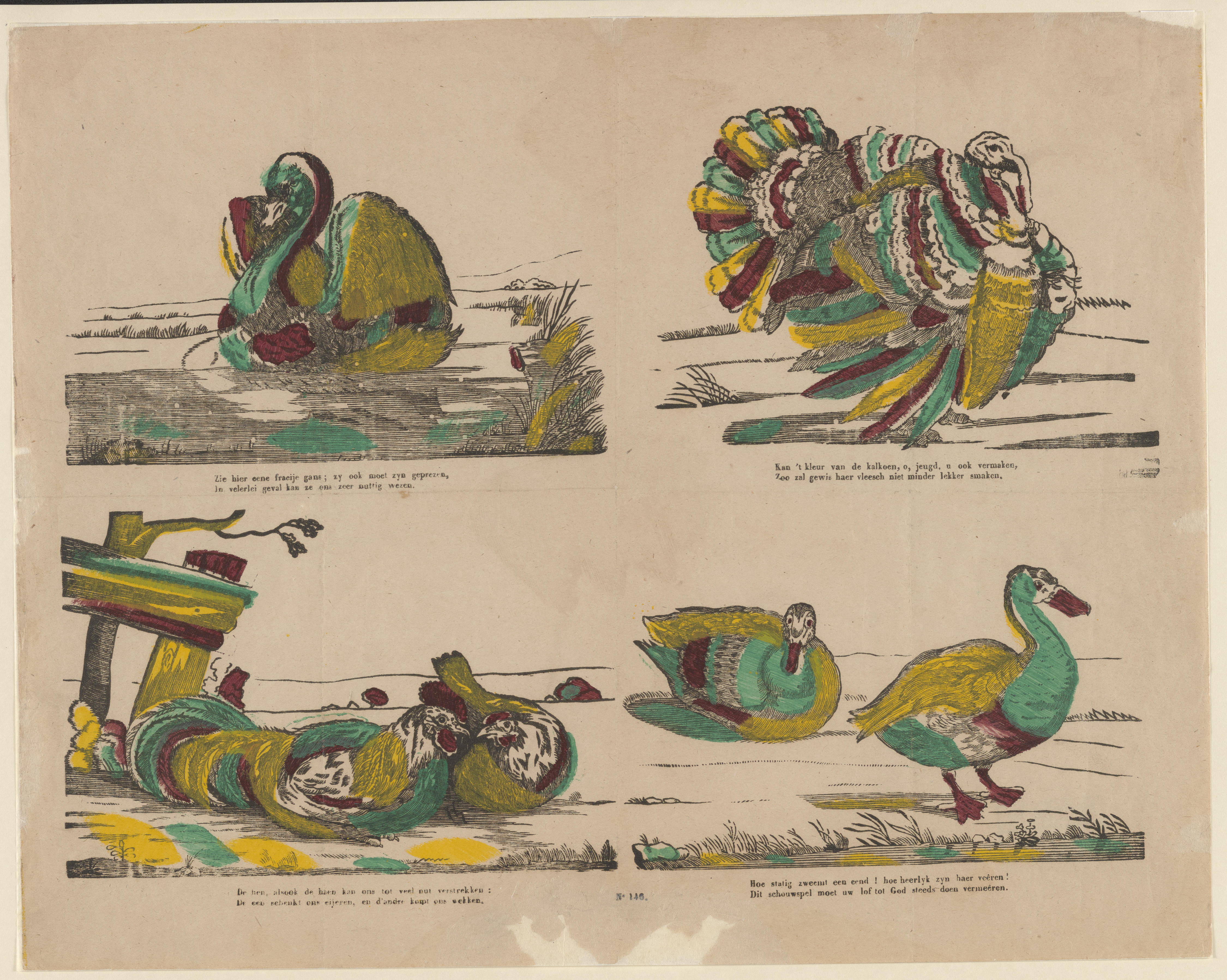 Prent met voorstellingen van een zwaan, een kalkoen, een haan en een kip en twee eenden. Onder elke voorstelling staat een tweeregelig vers. Op de prent is geen uitgever vermeld. De prent is toegeschreven aan de Turnhoutse uitgever Glenisson & van Genechten of zijn opvolger Glenisson & Zonen.