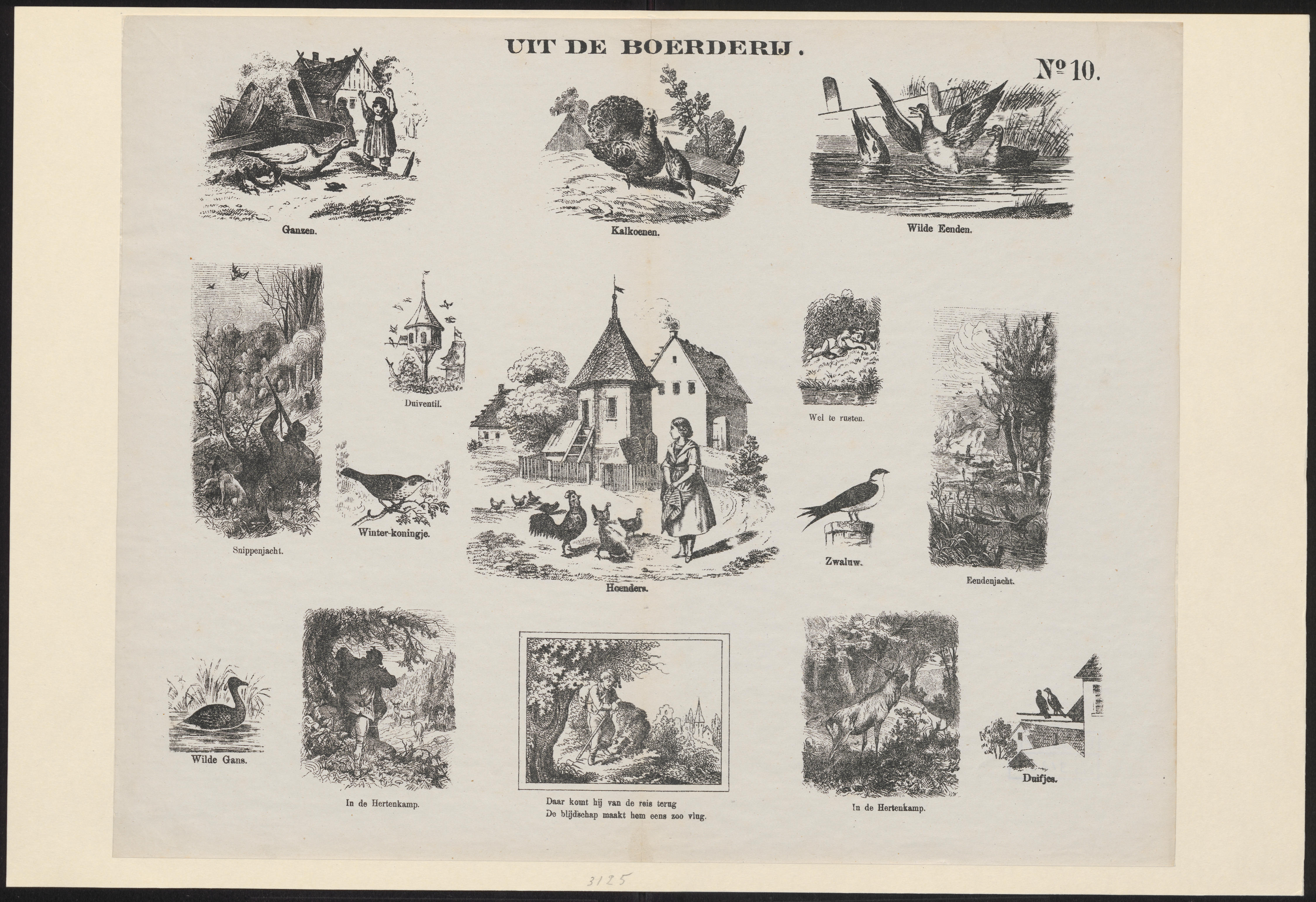 Prent met vijftien afbeeldingen van taferelen op en rond de boerderij en van de jacht, gedrukt in lithografie. Onder iedere afbeelding staat een onderschrift. Op de prent staat geen uitgeversadres. Hij is toegeschreven aan De Ruyter & Meijer in Amsterdam.