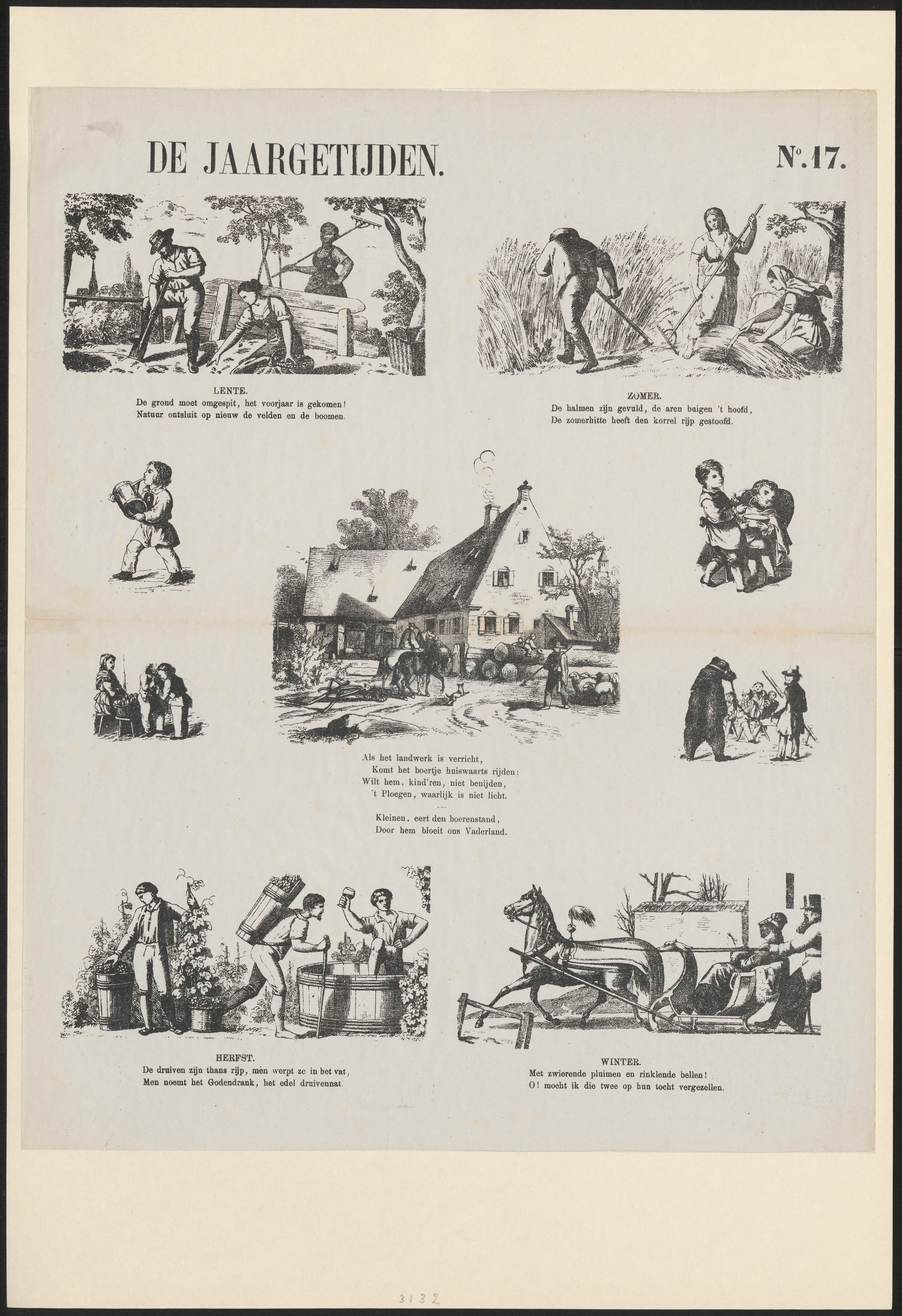 Prent met negen afbeeldingen van werkzaamheden en bezigheden die bij verschillende jaargetijden horen, gedrukt in lithografie. Onder vijf afbeeldingen staat een onderschrift. Op de prent staat geen uitgeversadres. Hij is toegeschreven aan De Ruyter & Meijer in Amsterdam.