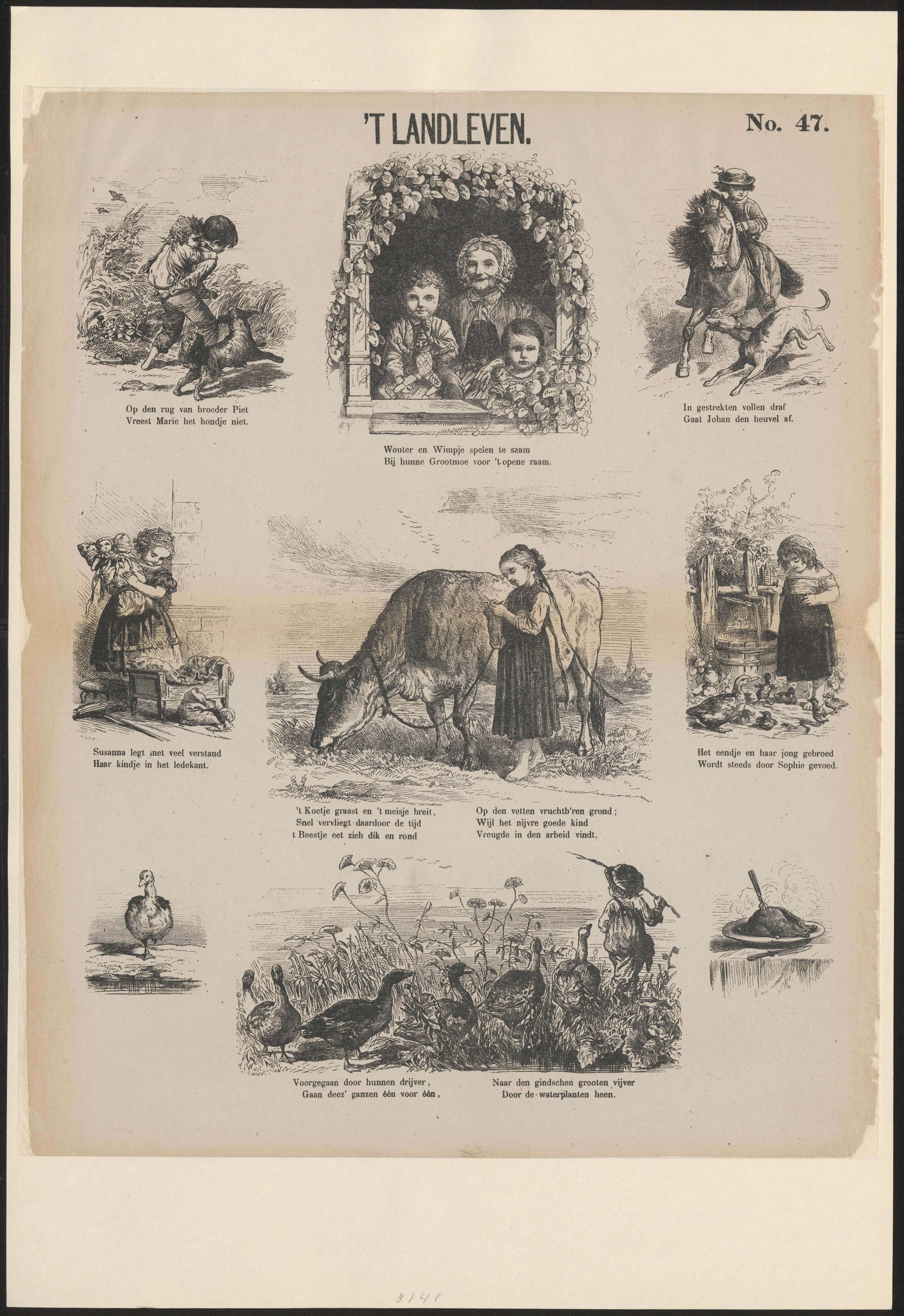Prent met negen landelijke taferelen, gedrukt in lithografie. Onder zeven afbeeldingen staat een onderschrift. Op de prent staat geen uitgeversadres. Hij is toegeschreven aan De Ruyter & Meijer in Amsterdam.