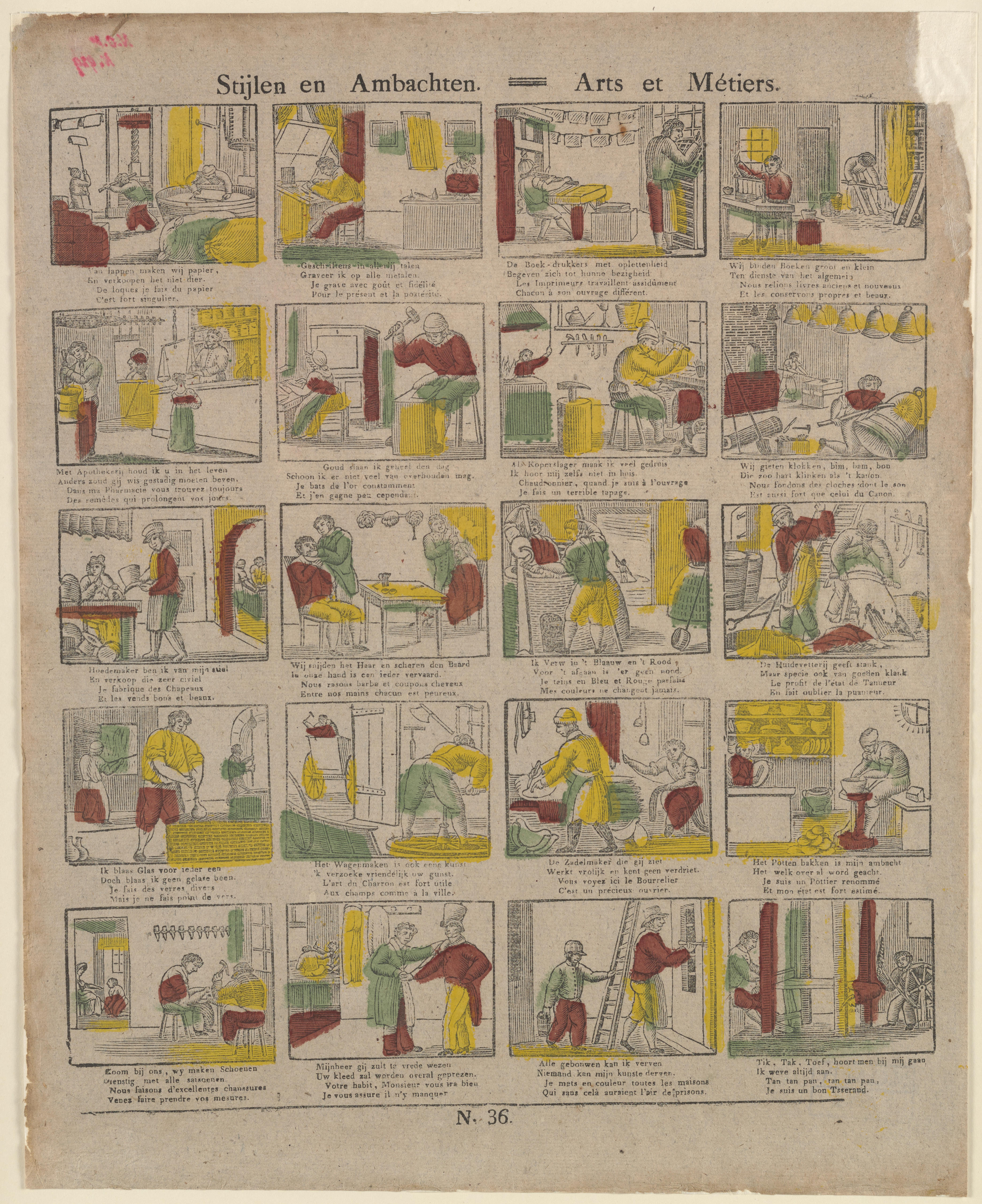 Prent met verschillende ambachten en beroepen, gedrukt met twintig afzonderlijke houtsneden en ingekleurd met rood, groen en geel. Op de prent is geen uitgever vermeld. Deze prent is uitgegeven door P.J. Brepols in Turnhout of door één van zijn opvolgers.
