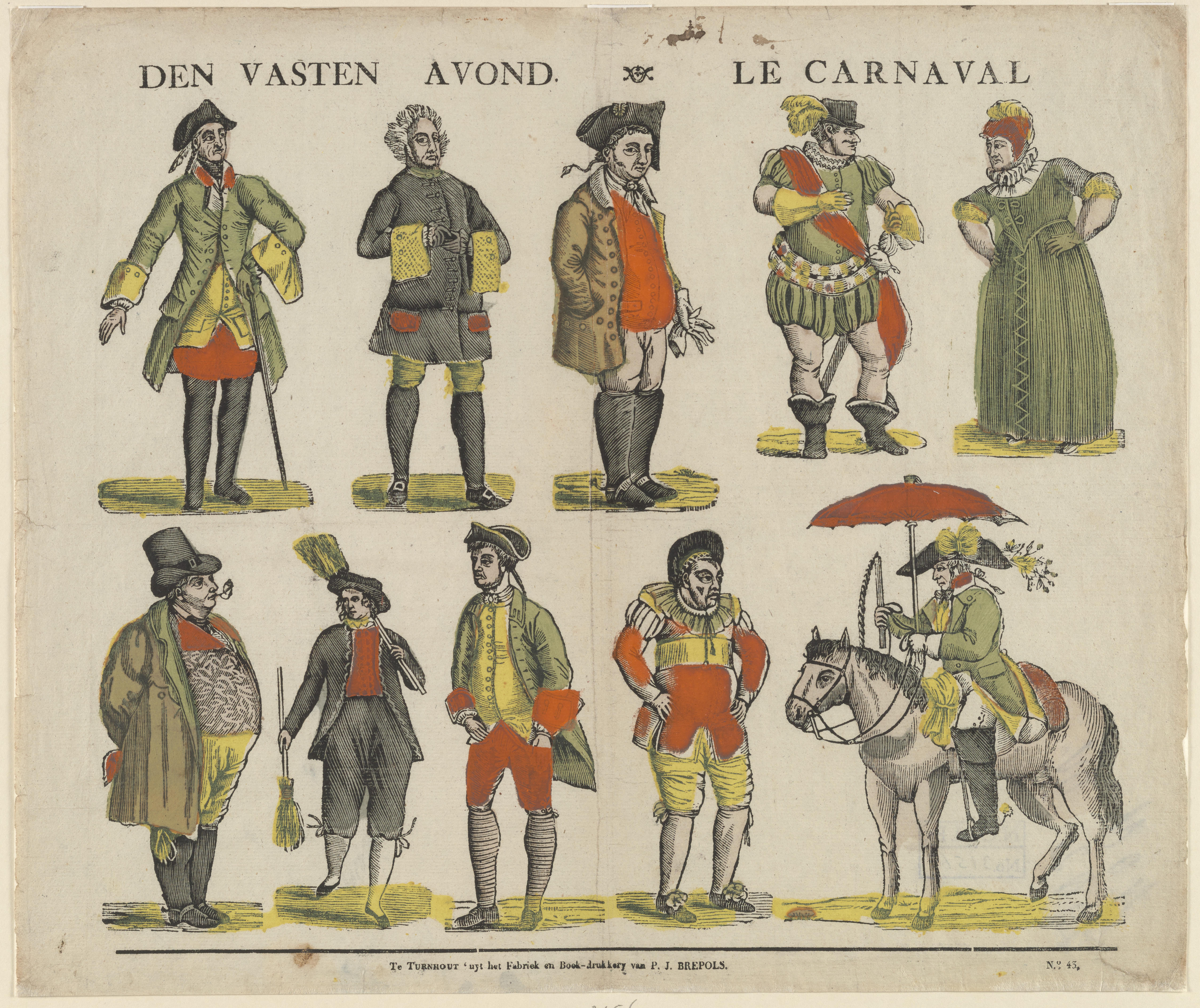 Prent met karikaturale figuren in achttiende-eeuwse kleding, gedrukt met tien afzonderlijke houtsneden en ingekleurd met oranje, geel en groen. De prent is uitgegeven door P.J. Brepols.