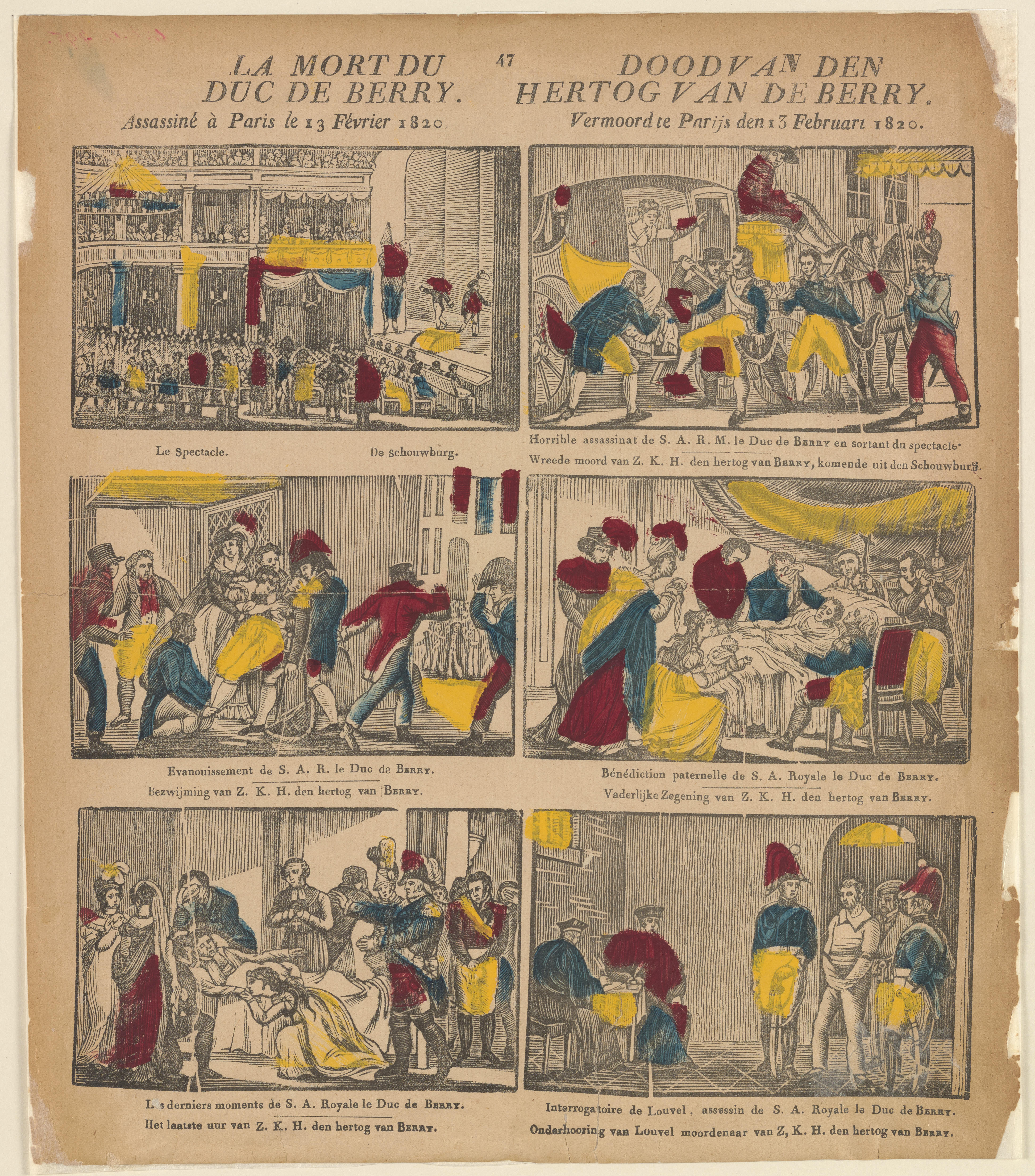 Prent over de moordaanslag op hertog Karel Ferdinand van Berry. De hertog werd op 13 februari 1820 neergestoken bij de opera in Parijs door Louis Pierre Louvel. Hij stierf de volgende dag. De prent is gedrukt met zes houtsneden en ingekleurd met rood, geel en blauw. Op de prent is geen uitgever vermeld. Deze prent ...