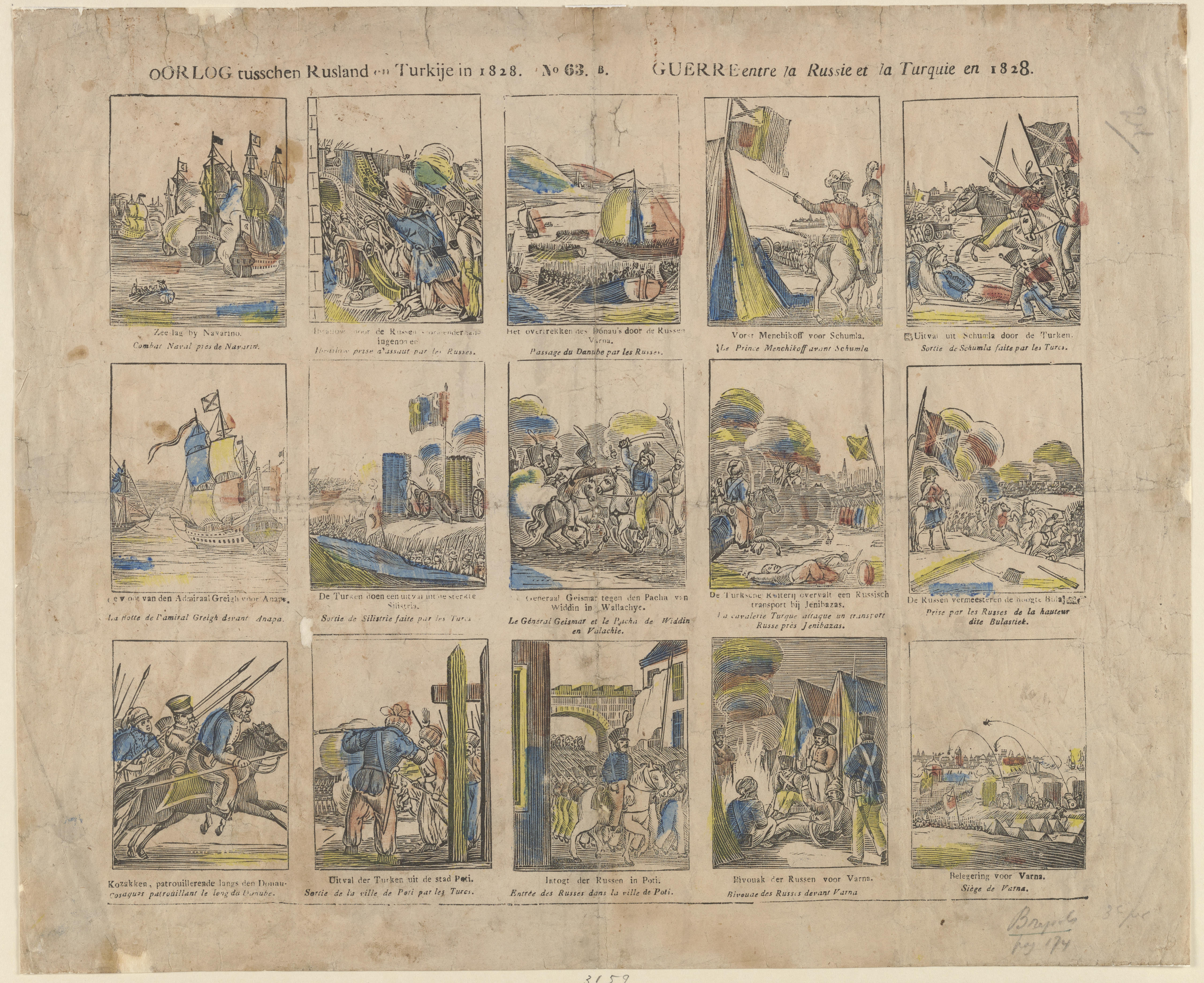 Verschillende scènes uit de oorlog tussen Rusland en Turkije in 1828-1829, gedrukt met vijftien afzonderlijke houtsneden en ingekleurd in geel, rood en blauw. Op de prent is geen uitgever vermeld. Deze prent is uitgegeven door P.J. Brepols in Turnhout of door één van zijn opvolgers.