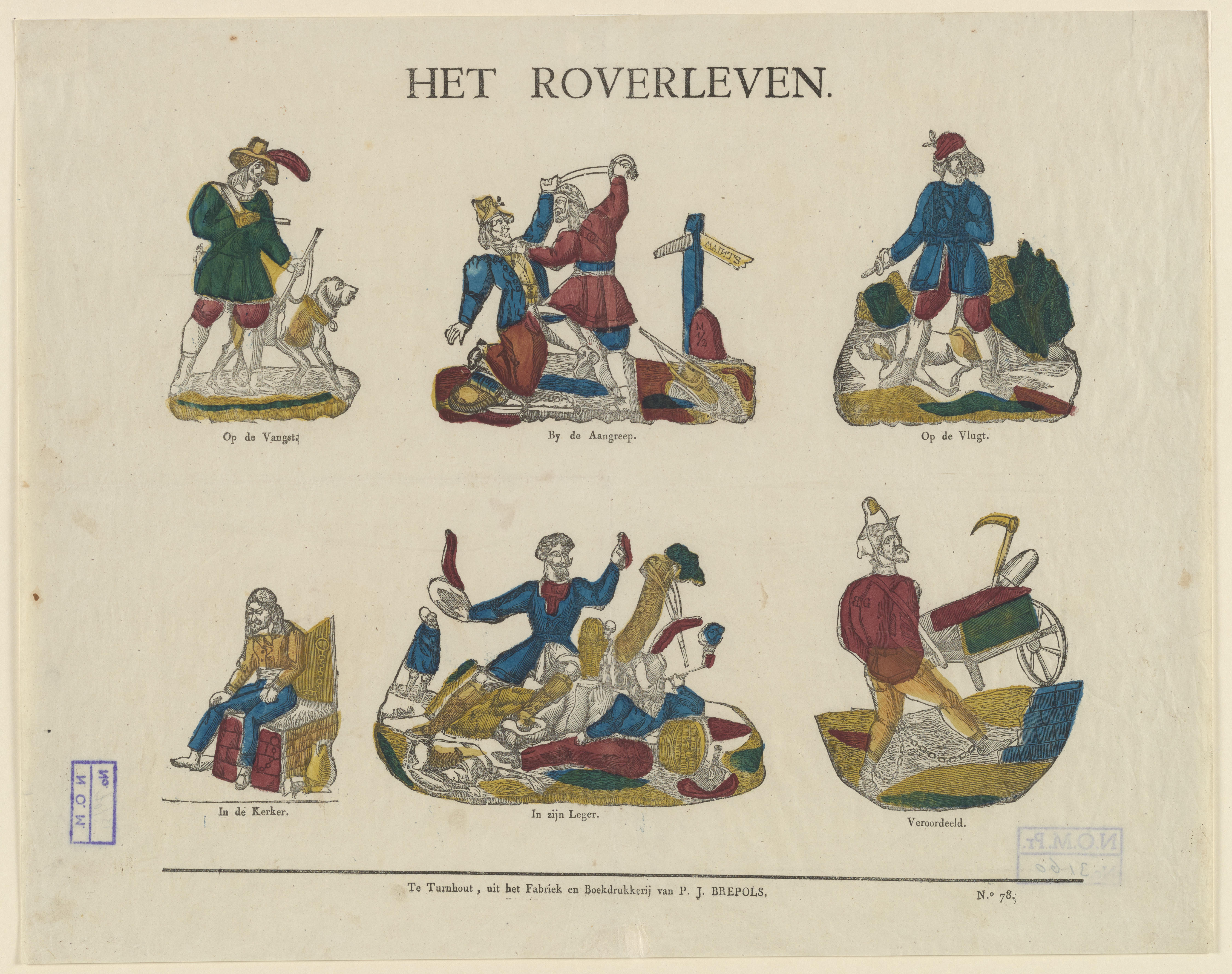 Prent met voorstellingen van het leven van een rover die gevangen en bestraft wordt, gedrukt met zes afzonderlijke houtsneden en ingekleurd met rood, geel en blauw. Onder elke afbeelding staat een onderschrift. De prent is uitgegeven door P.J. Brepols.