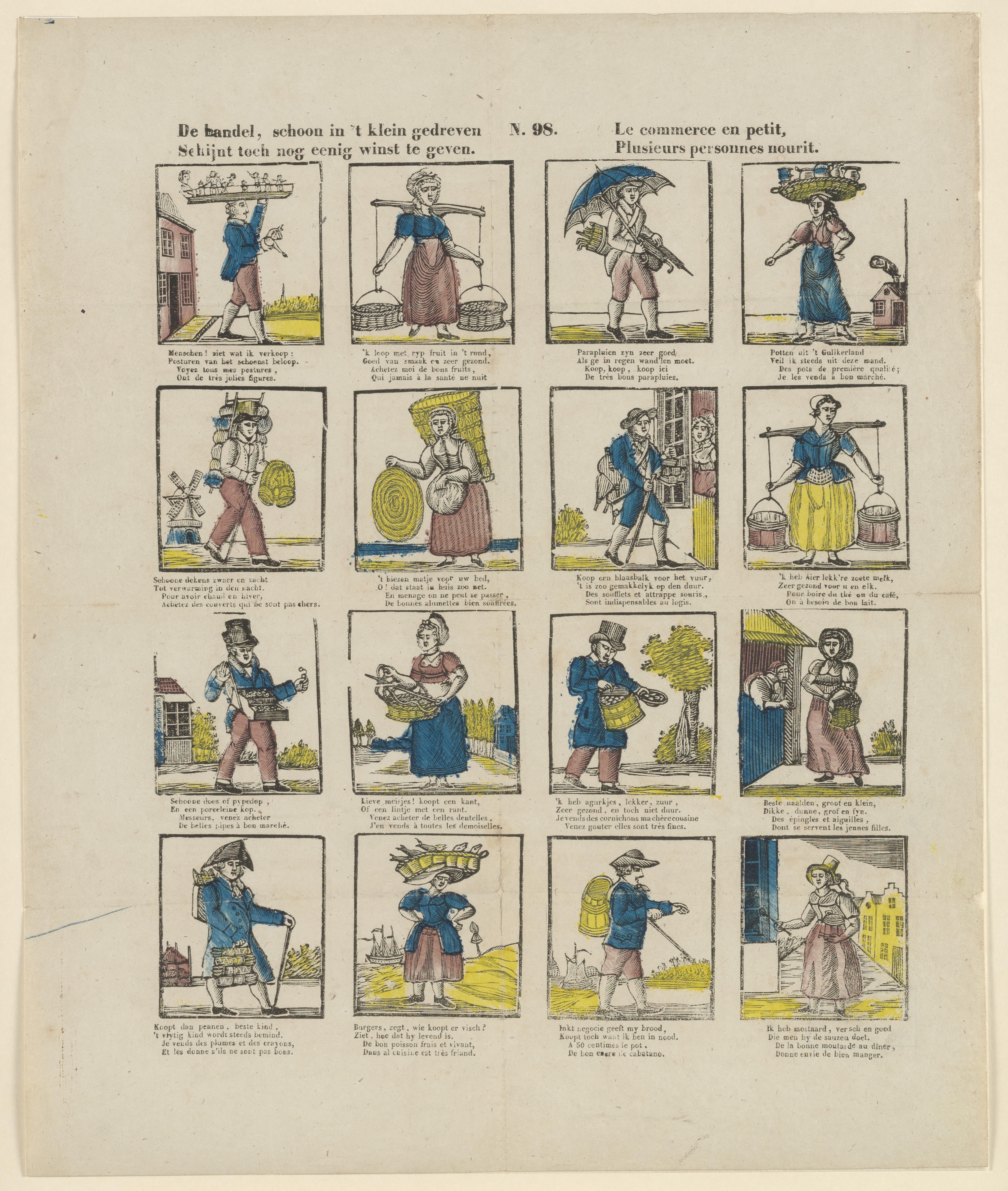 Prent met zestien afbeeldingen van leurders en straatverkopers. Elke afbeelding heeft een tweeregelig onderschrift in het Nederlands en het Frans. Op de prent is geen uitgever vermeld. De prent is toegeschreven aan de Turnhoutse uitgever Glenisson & van Genechten of zijn opvolger Glenisson & Zonen.