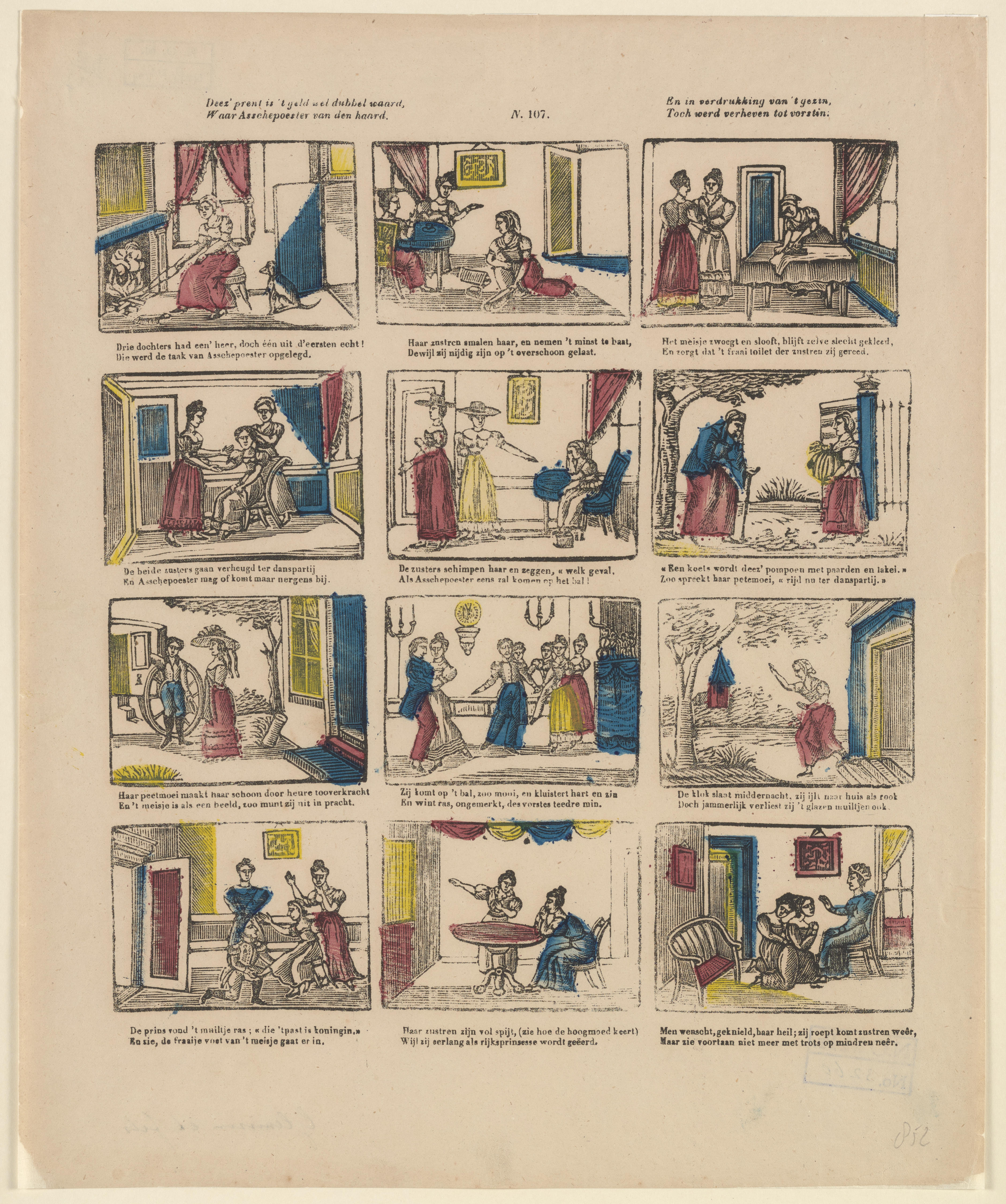 Prent met twaalf afbeeldingen uit het sprookje van Assepoester. Onder elke afbeelding staat een tweeregelig onderschrift. Op de prent is geen uitgever vermeld. De prent is toegeschreven aan de Turnhoutse uitgever Glenisson & van Genechten of zijn opvolger Glenisson & Zonen.