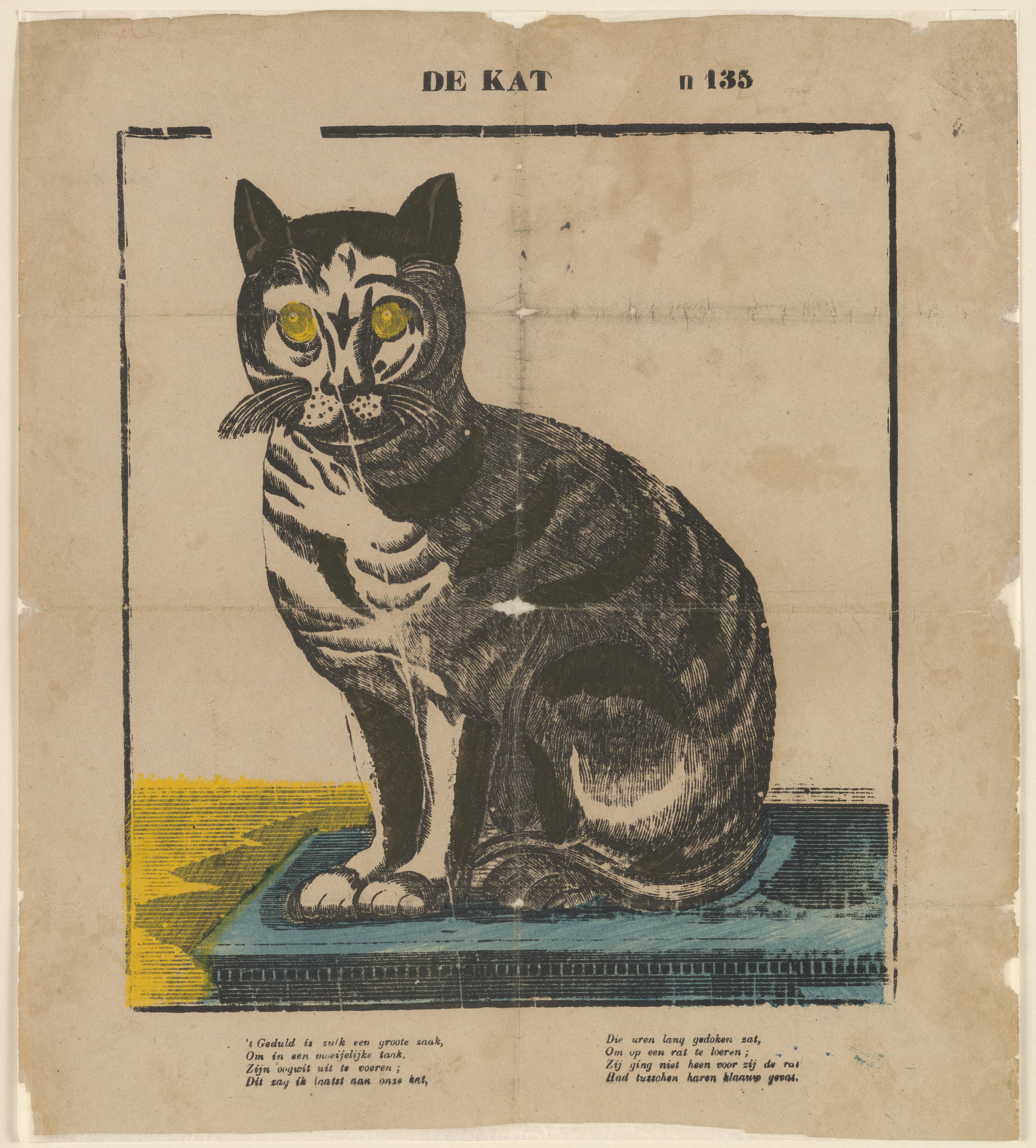 Prent met een afbeelding van een zittende kat. Onder de afbeelding staan twee vierregelige verzen. Op de prent is geen uitgever vermeld. De prent is toegeschreven aan de Turnhoutse uitgever Glenisson & van Genechten of zijn opvolger Glenisson & Zonen.