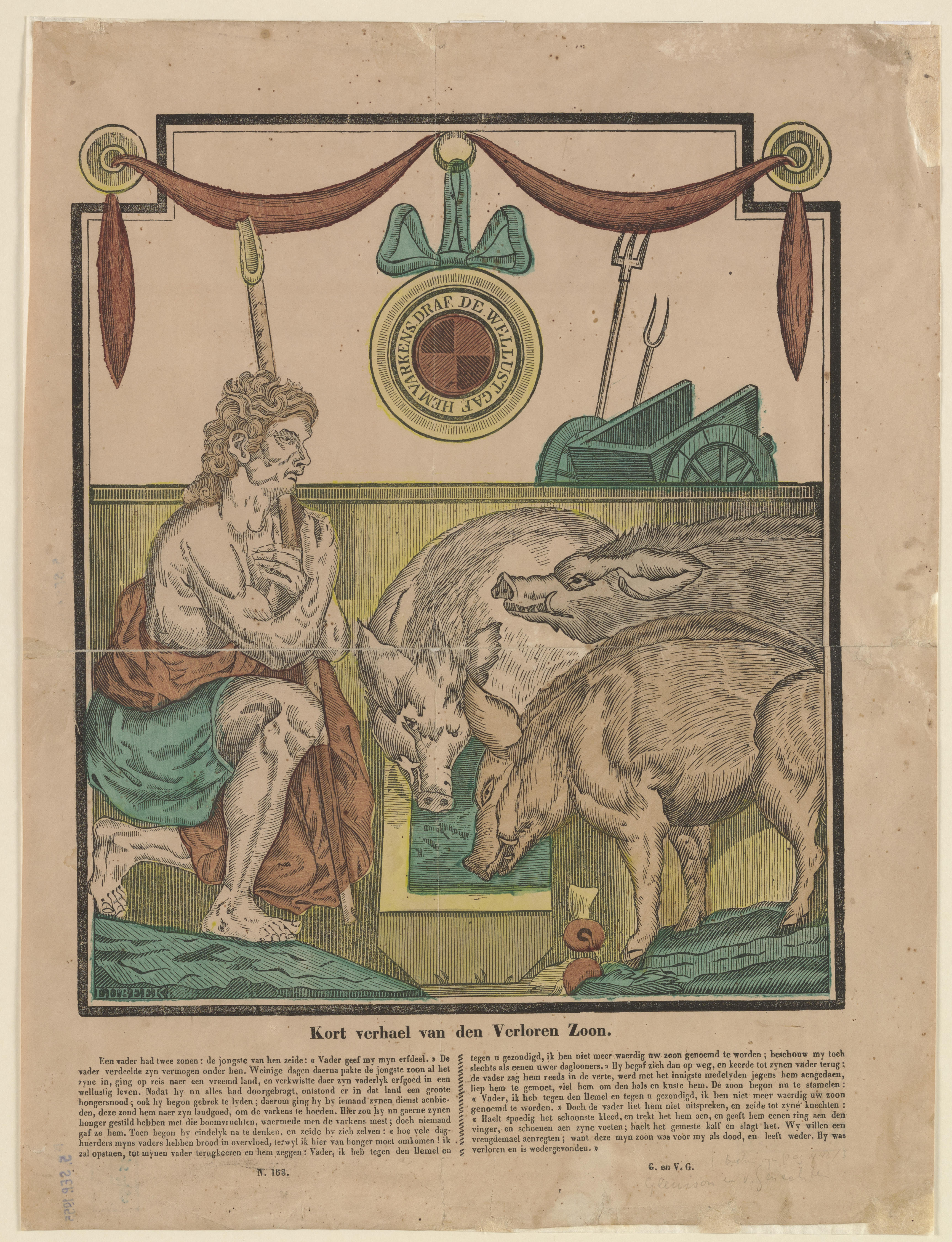 Prent met de afbeelding van de Verloren Zoon die varkens hoedt, gedrukt met een houtsnede en ingekleurd met geel, rood, groen en bruin. Onder de afbeelding staat een tekst. De prent is gedrukt door Glenisson & van Genechten in Turnhout. Linksonder staat de signatuur van houtgraveur Hermanus van Lubeek.
