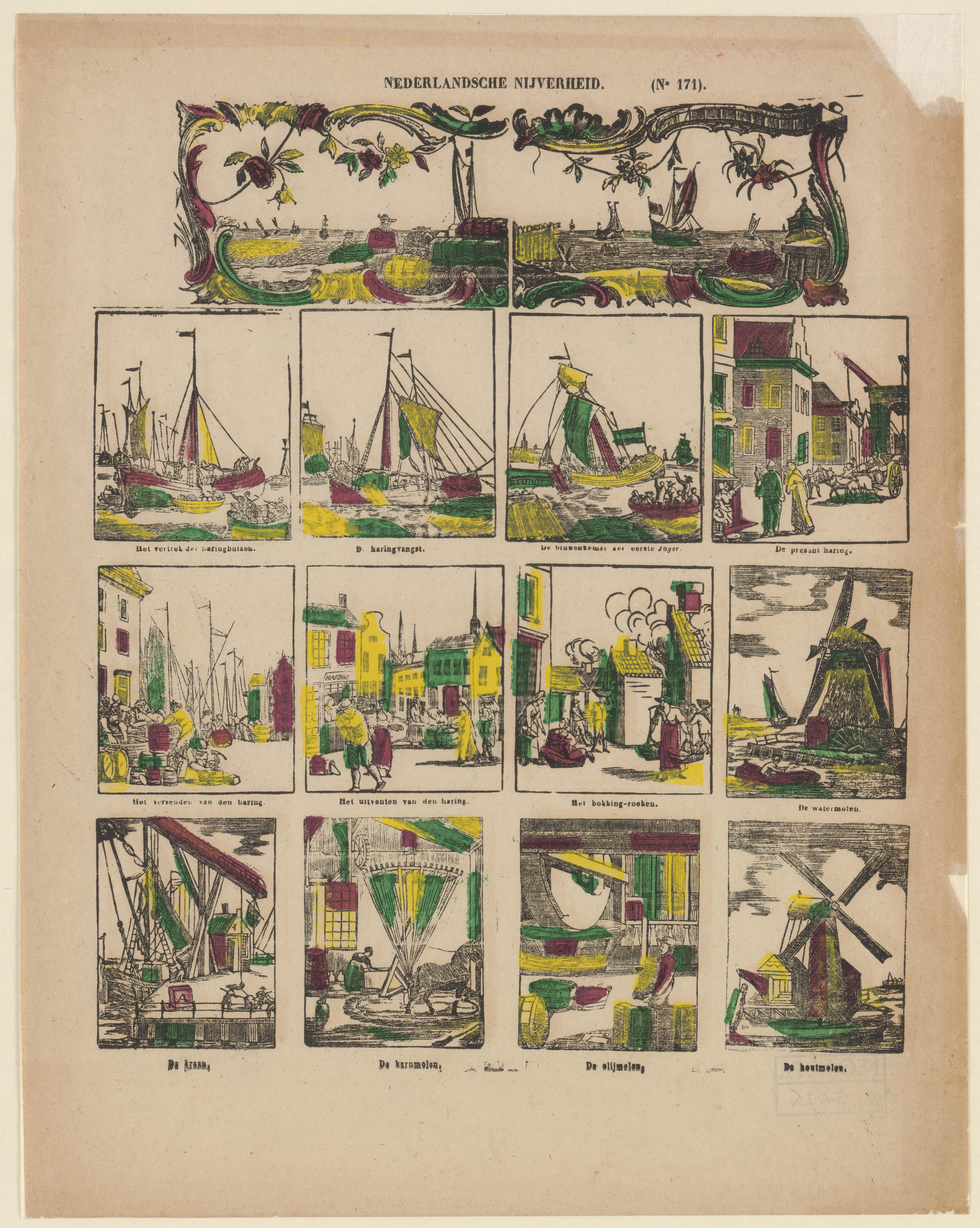 Prent met afbeeldingen van verschillende typen molens en scènes die te maken hebben met de haringnijverheid. Op de prent staat geen uitgever vermeld. De prent is gedrukt door Glenisson & van Genechten in Turnhout of zijn opvolger Glenisson & Zonen.