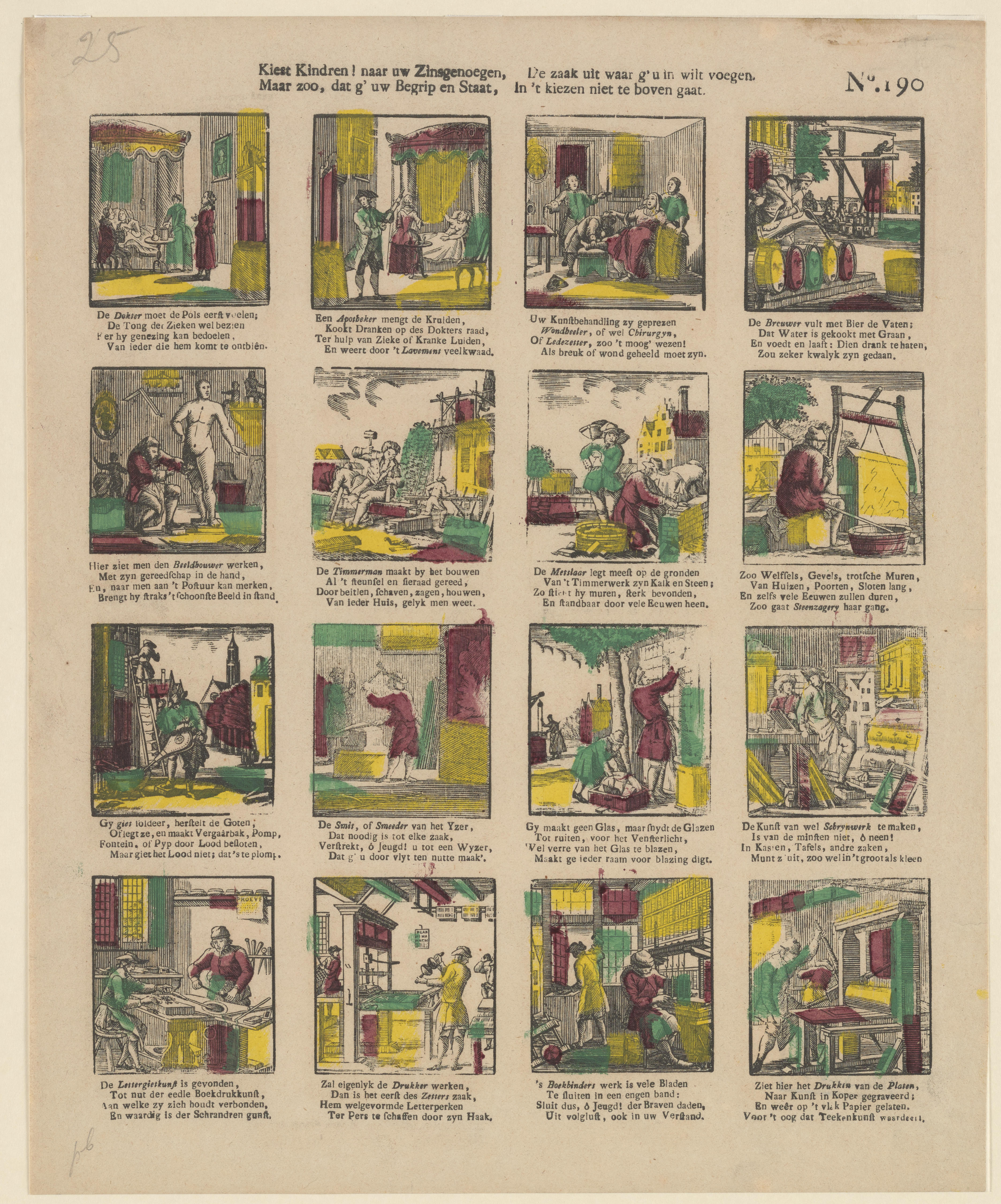 Prent met zestien voorstellingen van ambachten en beroepen. Onder elke afbeelding staat een vierregelig vers. Op de prent is geen uitgever vermeld. De prent is toegeschreven aan de Turnhoutse uitgever Glenisson & van Genechten of zijn opvolger Glenisson & Zonen.
