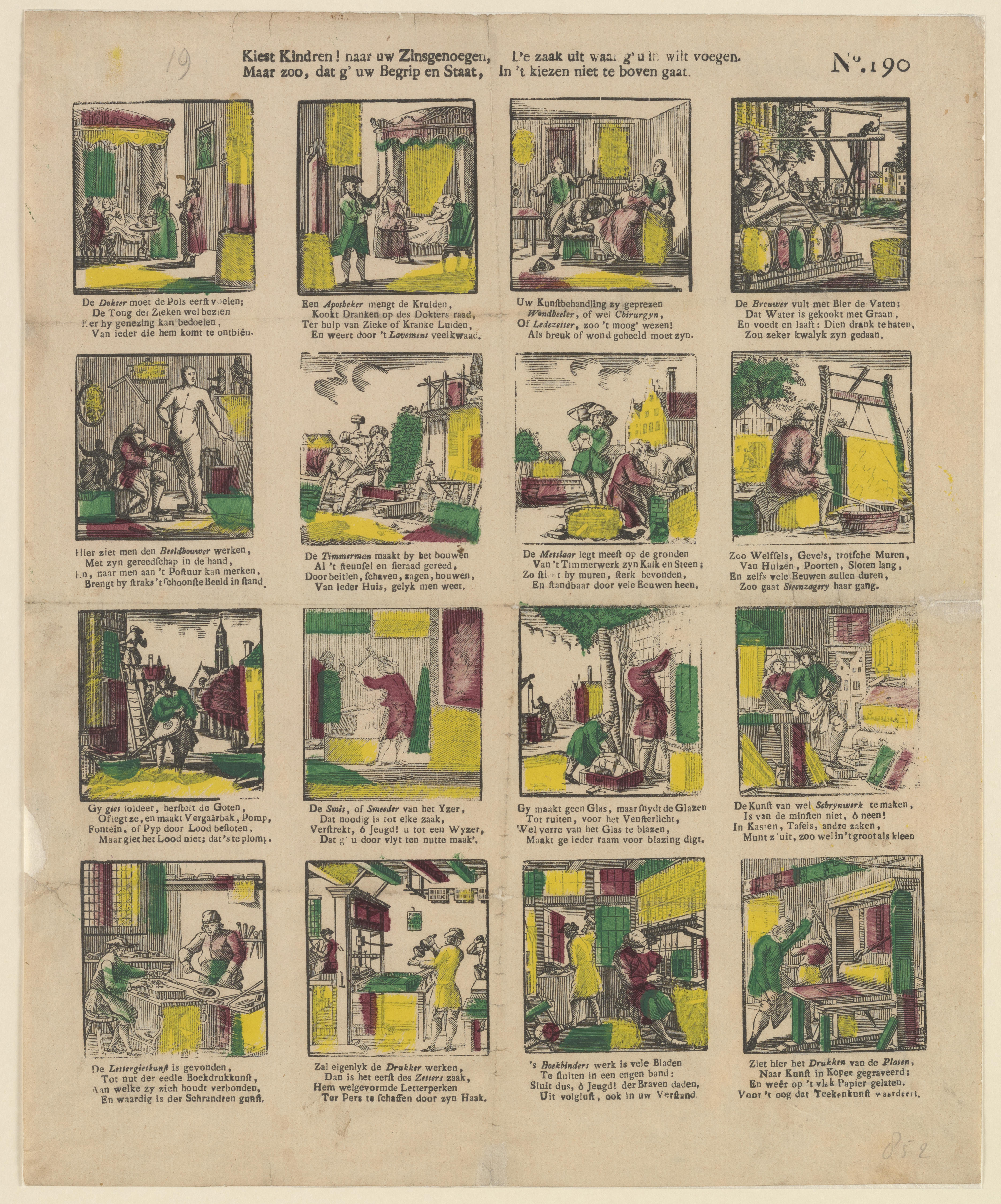 Prent met zestien voorstellingen van ambachten en beroepen. Onder elke afbeelding staat een vierregelig vers. Op de prent is geen uitgever vermeld. De prent is toegeschreven aan de Turnhoutse uitgever Glenisson & van Genechten of zijn opvolger Glenisson & Zonen.