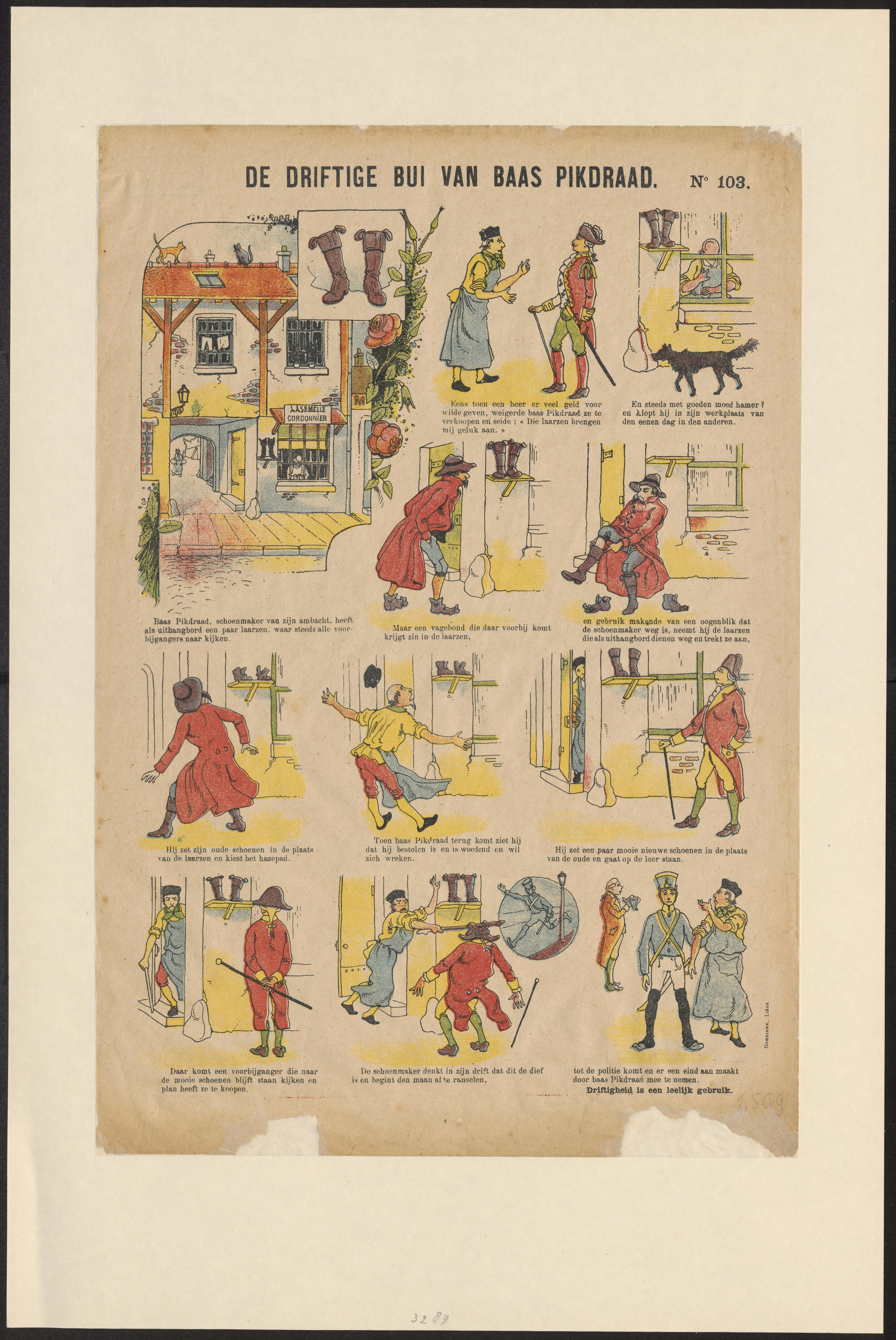 Prent met elf afbeeldingen van het verhaal over een schoenmaker die de verkeerde man beschuldigt van diefstal. Vervolgens wordt de schoenmaker gearresteerd. Onder de afbeeldingen staan bijschriften in het Nederlands.