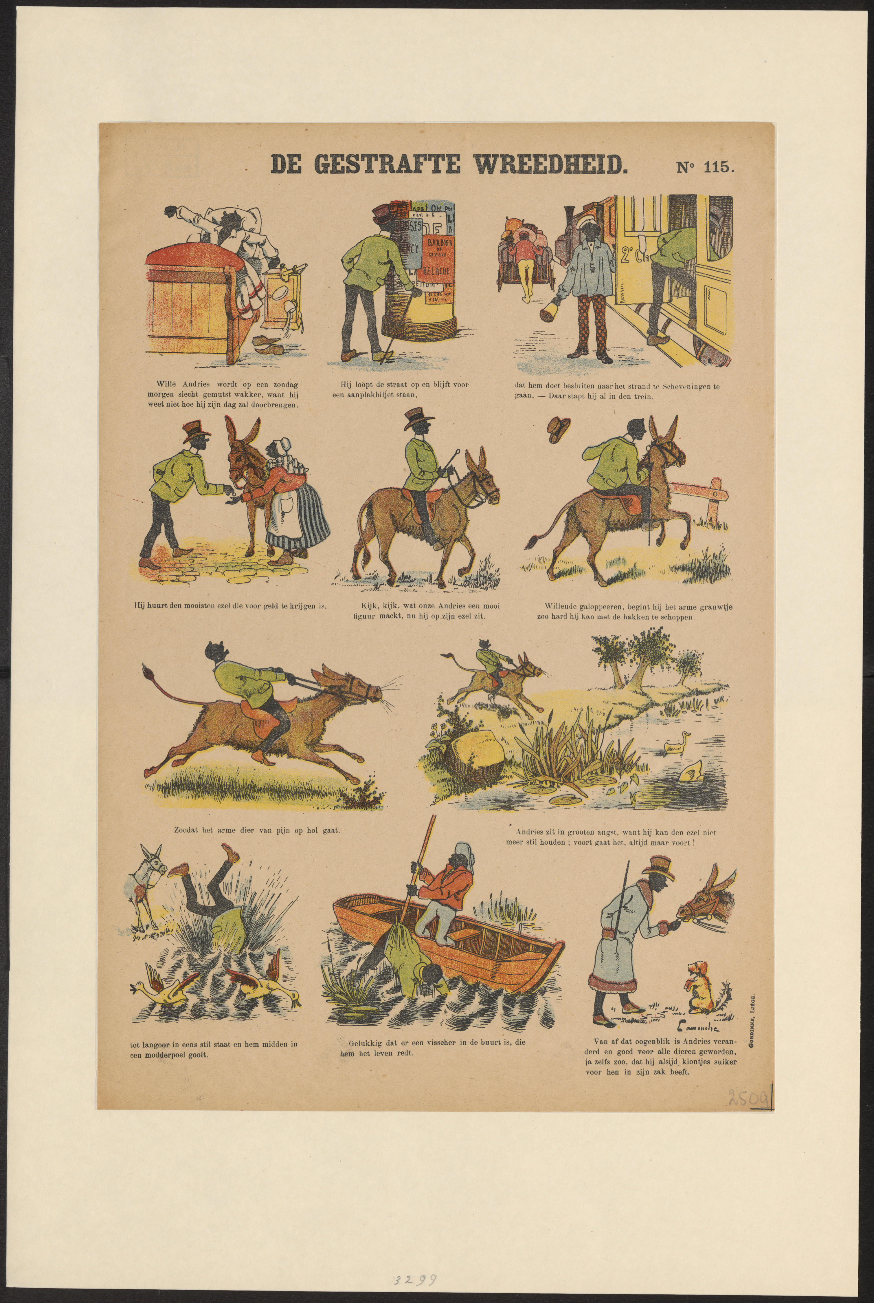 Prent met elf afbeeldingen van Andries, die een ezel mishandelt en vervolgens door de ezel in het water wordt geworpen. Onder de afbeeldingen staan bijschriften in het Nederlands.