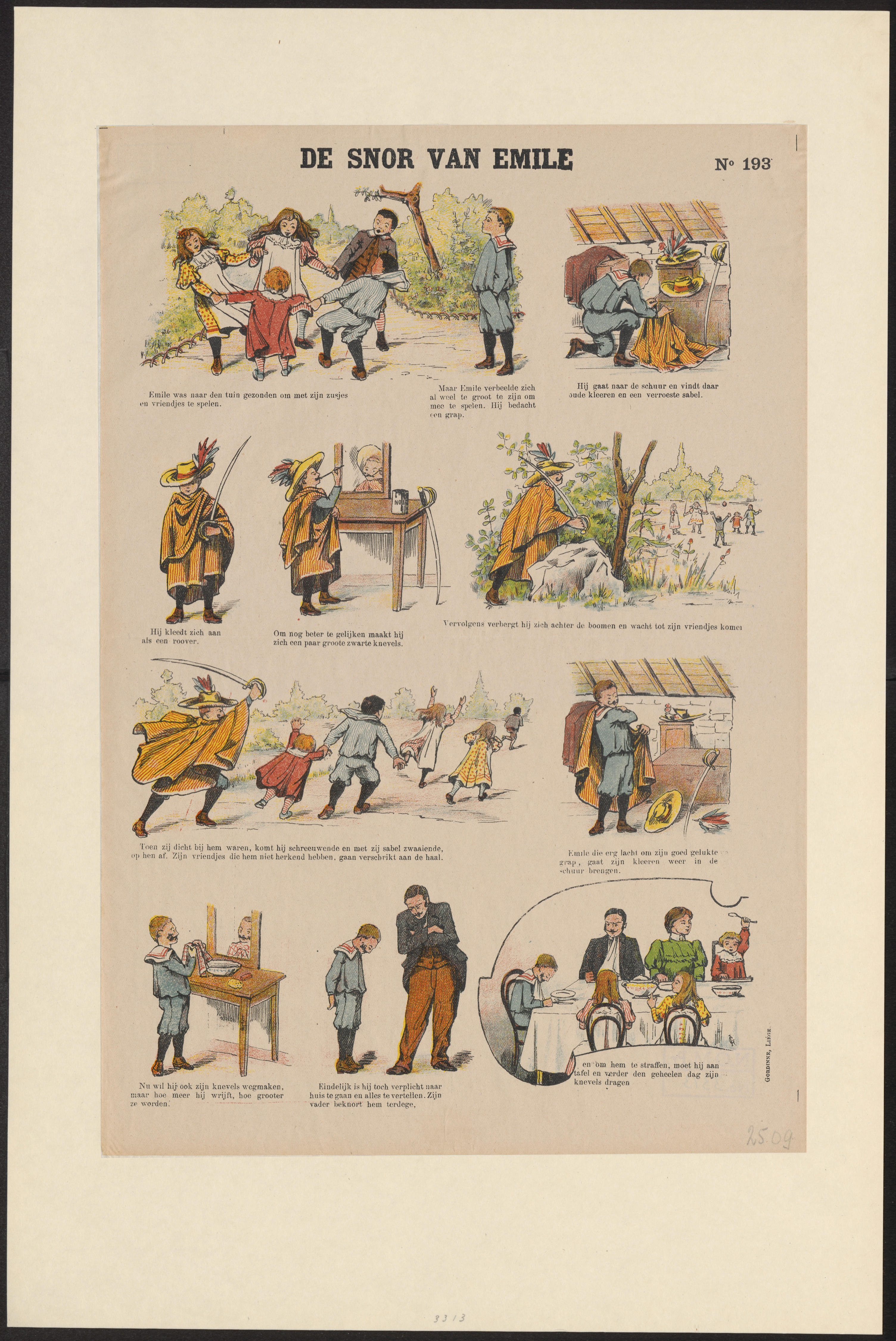 Prent met tien afbeeldingen van het moraliserende verhaal over Emile, die zijn zusjes en vriendjes schrik aanjaagt door zich als rover te verkleden. Onder de afbeeldingen staan bijschriften in het Nederlands.